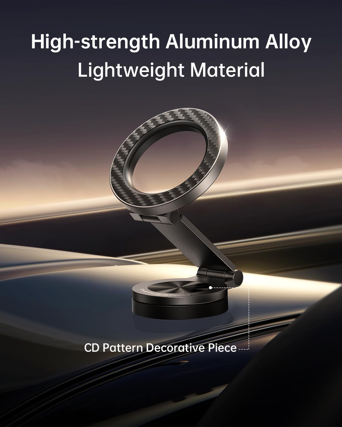 - 【360° Rotation &Two-Axis Foldable Design】With a 360° rotatable base and two-axis adjustable aluminum alloy arm, this design can be flexibly adjusted to create a variety of angles. You can fix the MagSafe car mount in any scene, such as car dashboard, windshield, Tesla screen, and desktop. The foldable design enables you to hide the car phone holder to create a neater use environment.