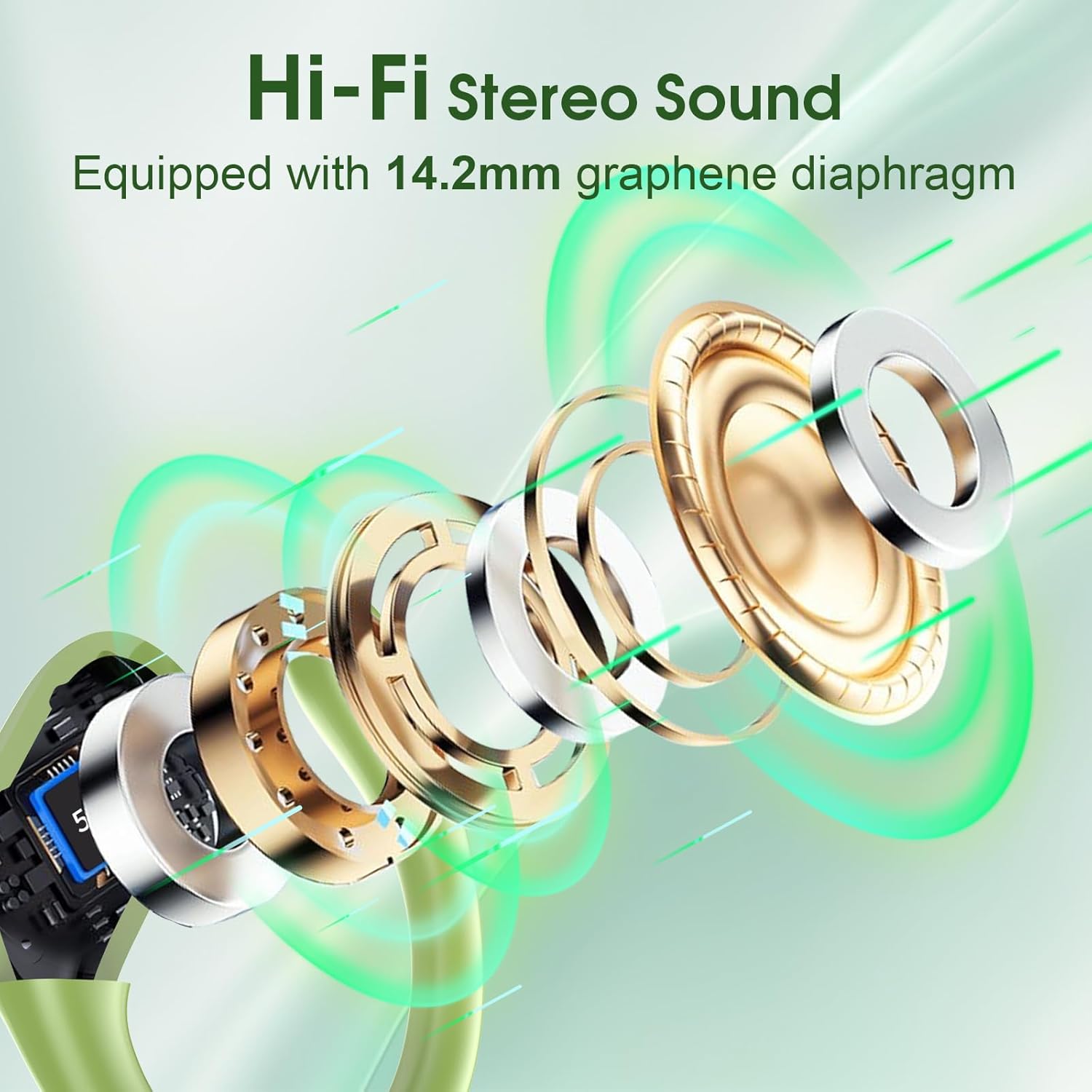- Hi-Fi Deep Bass Stereo and Crystal Clear Calls: Bluetooth earphones 14.2mm large size speaker driver delivers powerful bass, mellow midrange, and clear treble, reproducing your music vividly to power your workout. Noise cancelling headphones are equipped with high quality ENC noise reduction mics to passively cancel 80% background noise so you and the caller can hear each other better and make crystal-clear calls with minimal background noise. Enjoy top-notch conversations wherever you are.