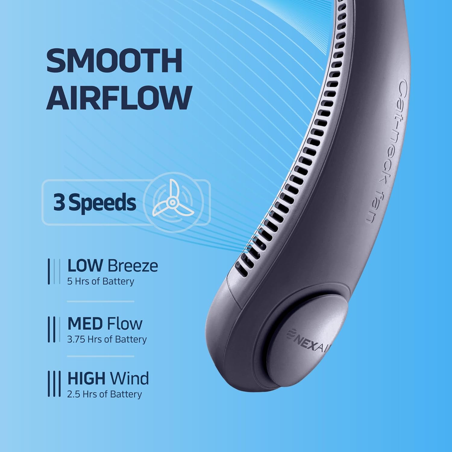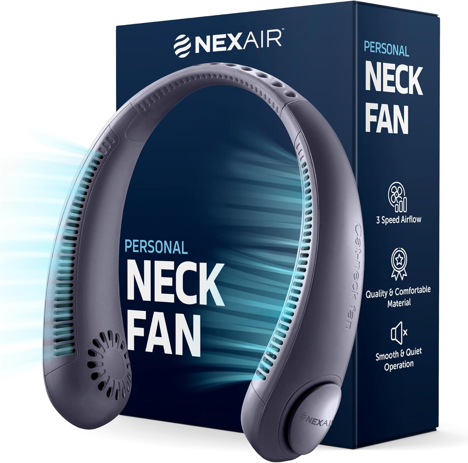 - WEARABLE FAN TO COOL ANYWHERE. This Neck Fan will give you the ultimate cooling experience anywhere and anytime, this fan is smooth and quiet operating, made of quality and comfortable material, which gives you a modern leafless neck fan. This has 48 double turbo air outlets with 3-speed airflow options.