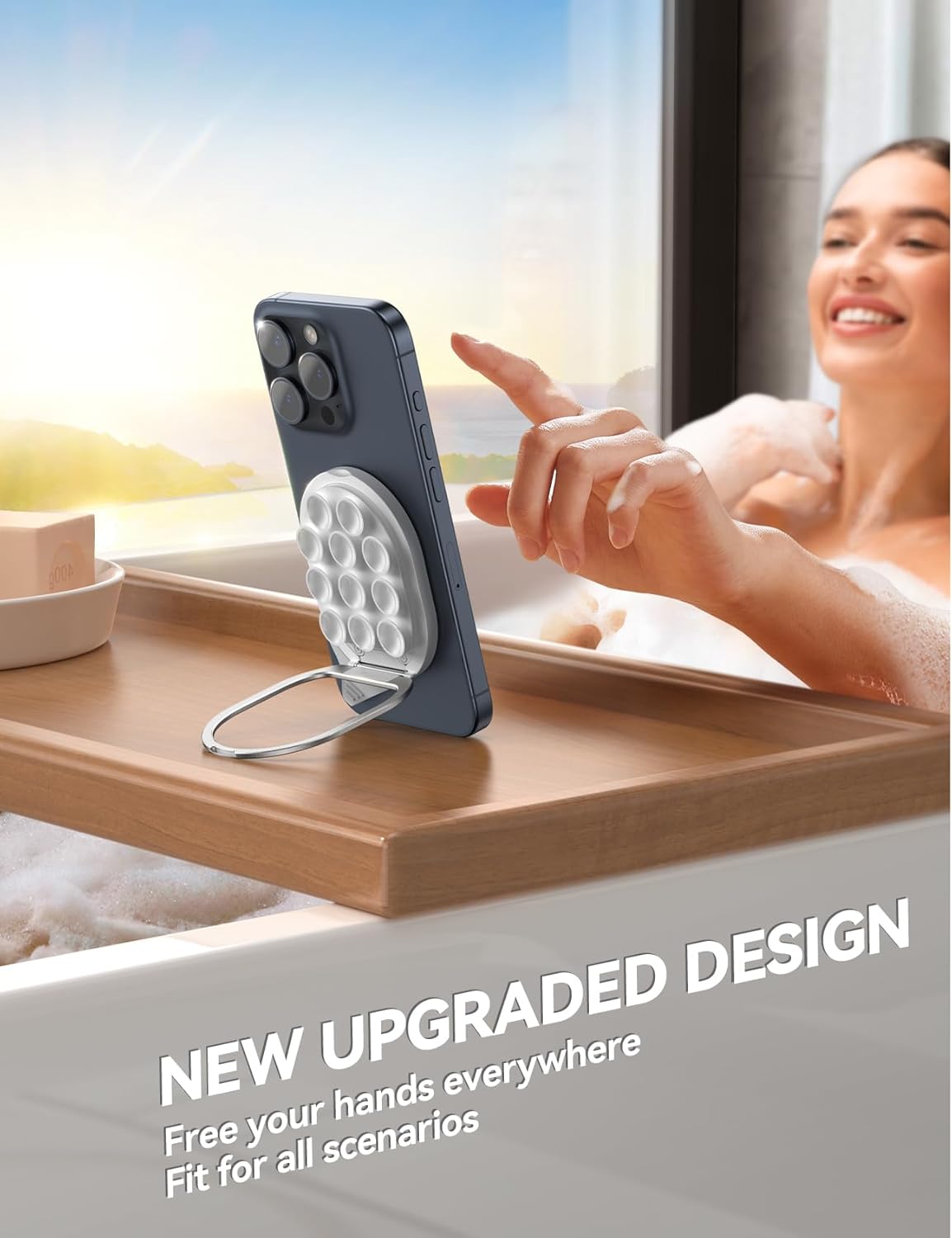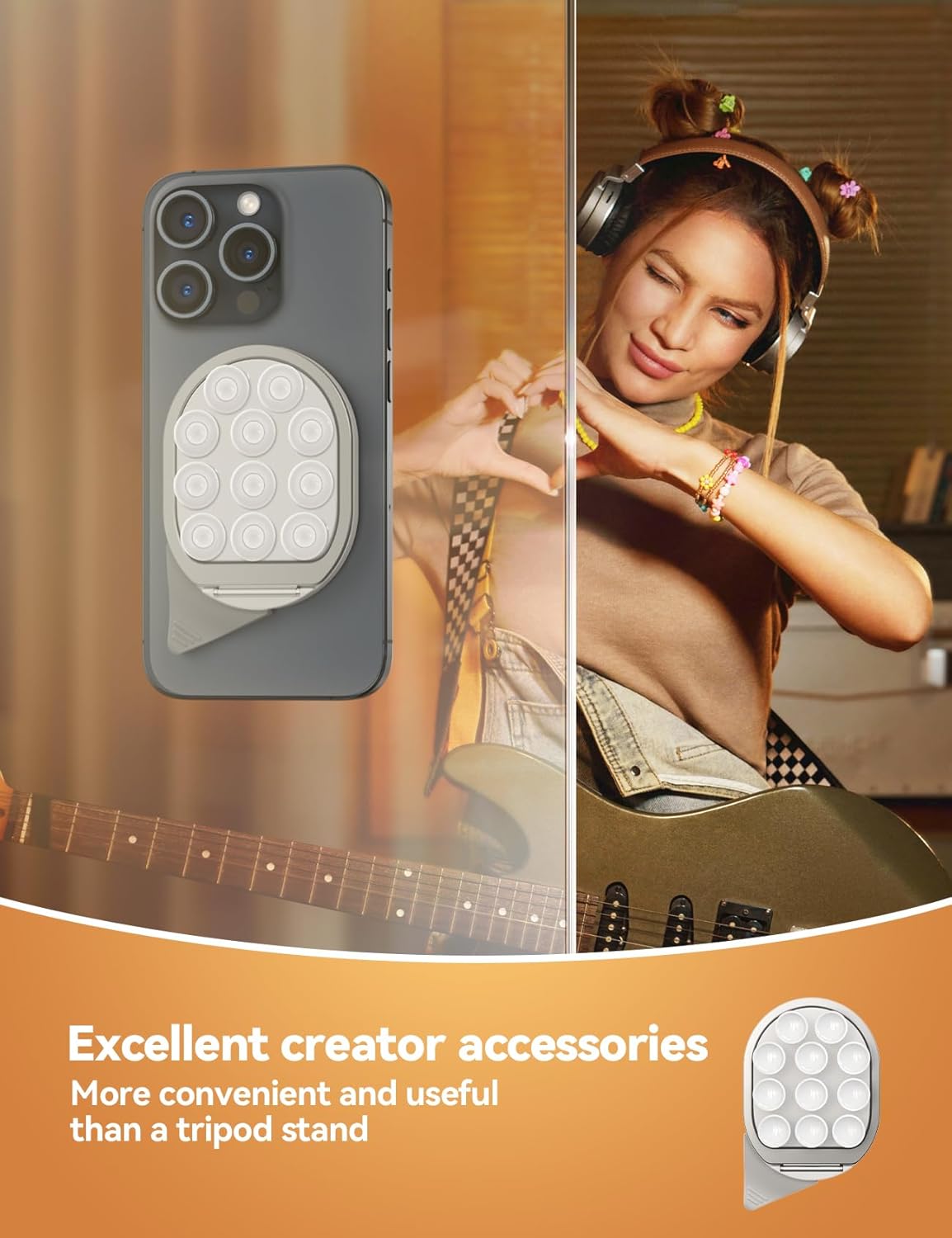 - 【Ultra Suction Power】The cellphone grips have upgraded 11 separate large suction cups, so never worry about falling and dropping. It Can be firmly attached to all clean and smooth surfaces (e.g. mirrors, windows, marble, refrigerator, screen, etc)