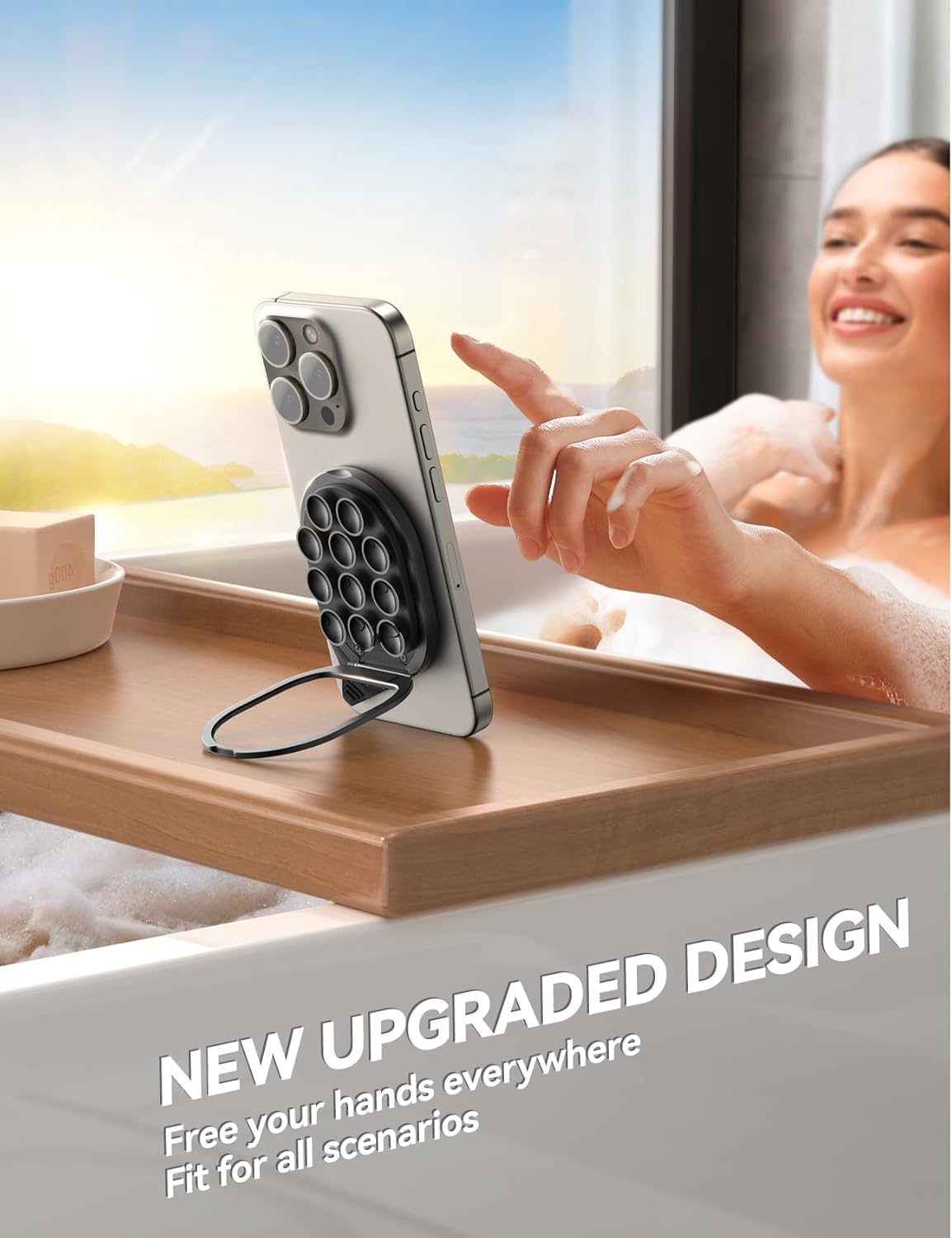- 【Ultra Suction Power】The cellphone grips have upgraded 11 separate large suction cups, so never worry about falling and dropping. It Can be firmly attached to all clean and smooth surfaces (e.g. mirrors, windows, marble, refrigerator, screen, etc)