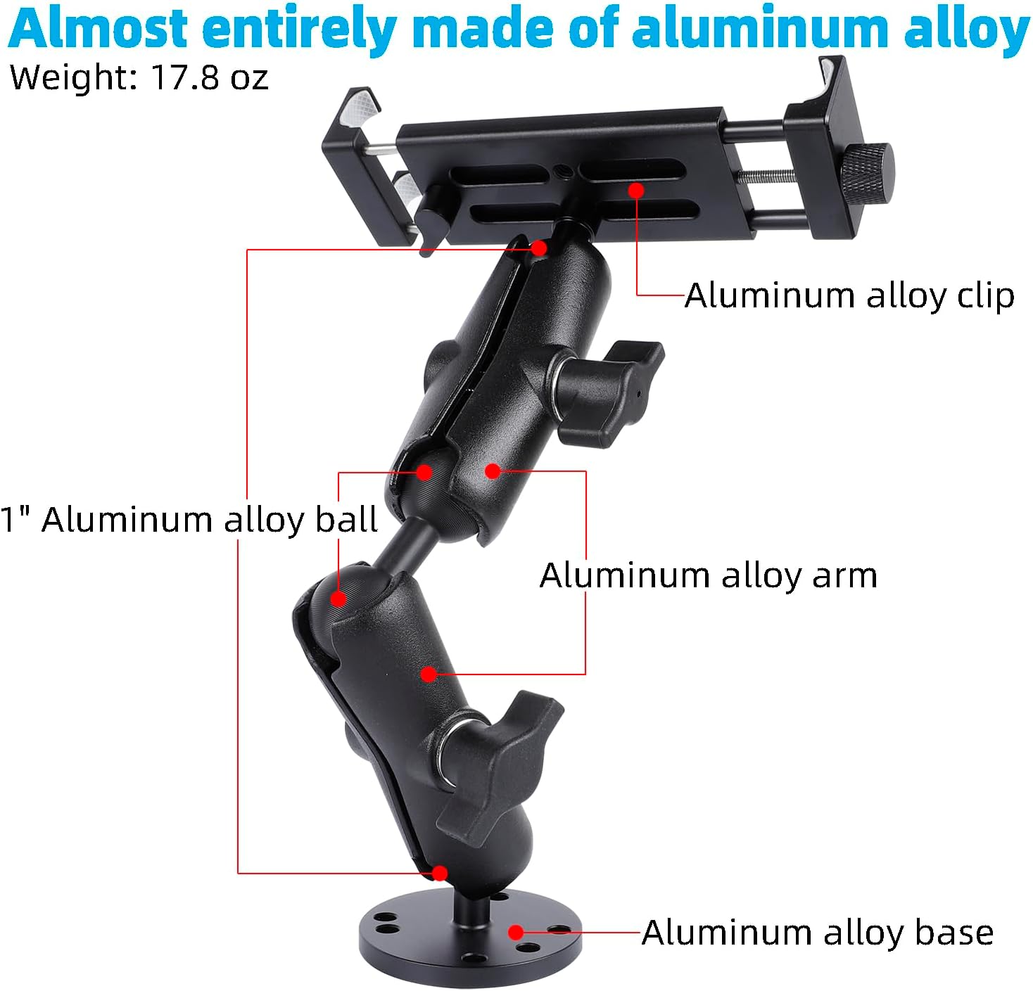 - Superior Weight Capacity: Thanks to its all-aluminum build, this tablet holder boasts exceptional load-bearing capacity. The dual articulating arms efficiently distribute force applied through the knob, ensuring a solid grip even on rugged terrain, making it a dependable choice for safeguarding your device.