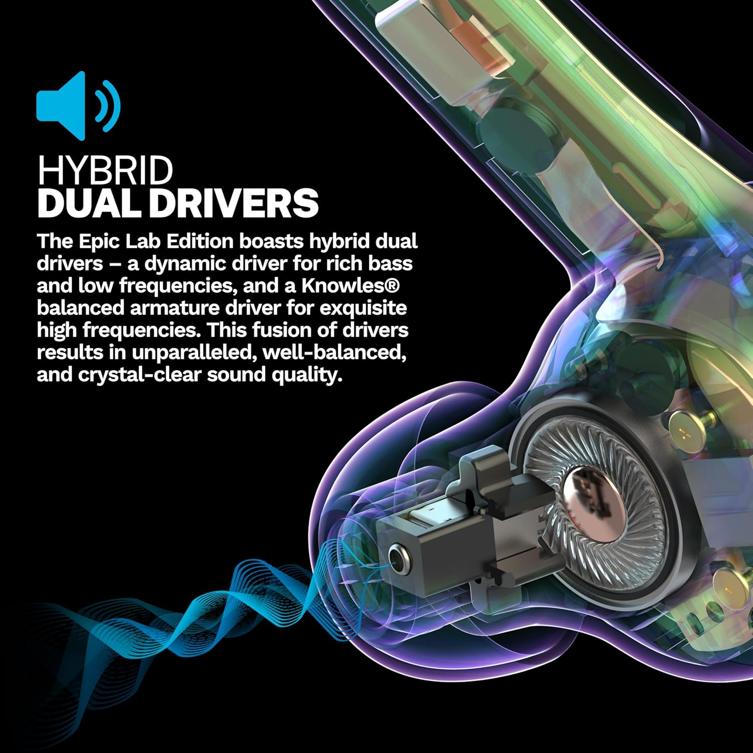 - 🎶 HYBRID DUAL DRIVERS: The Epic Lab Edition boasts hybrid dual drivers – a dynamic driver for rich bass and low frequencies, and a Knowles balanced armature driver for exquisite high frequencies. This fusion of drivers results in unparalleled, well-balanced, and crystal-clear sound quality. Here’s how Knowles created a balanced armature driver tuned for higher frequencies.
