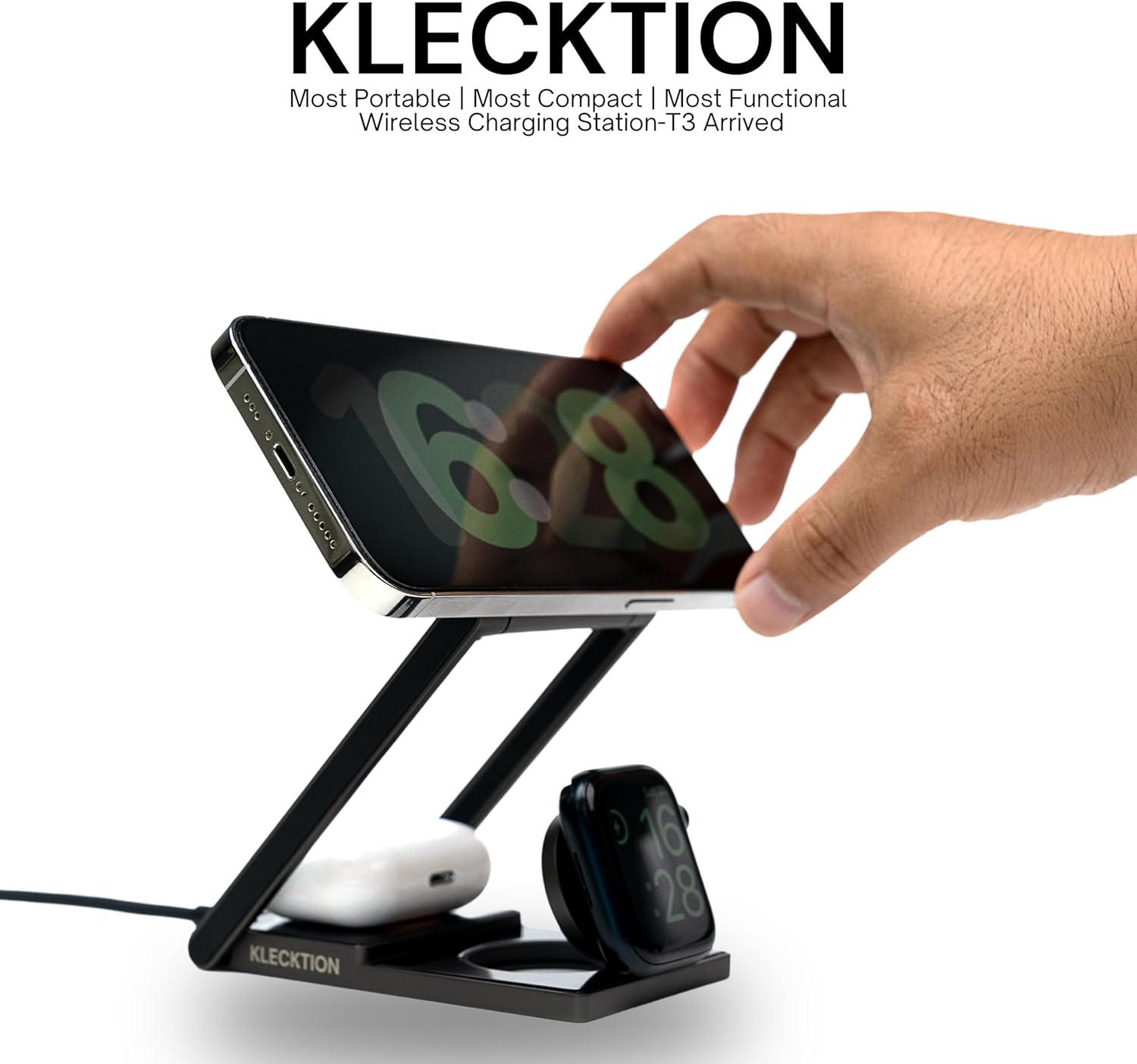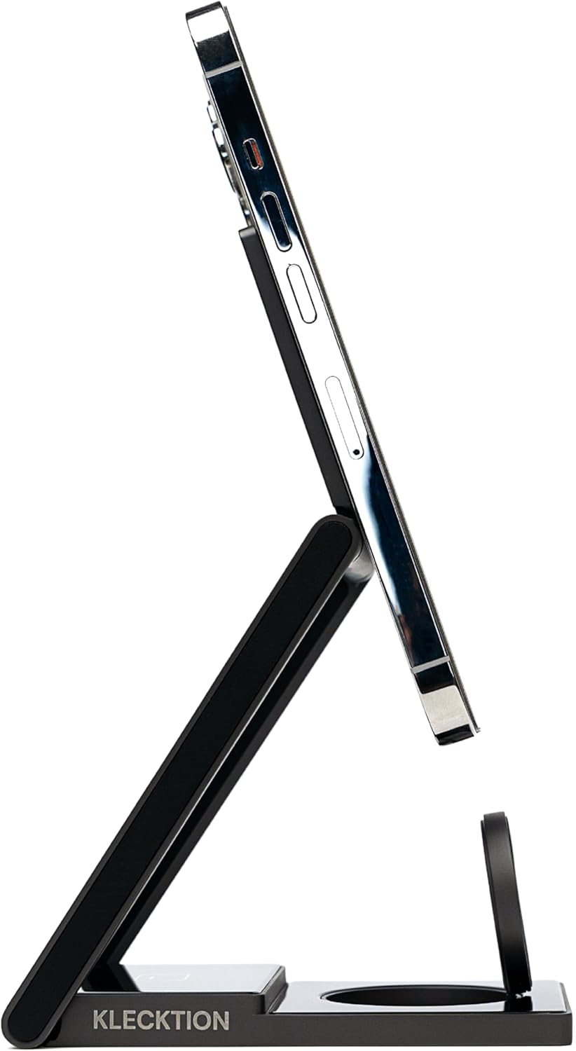 - [Multi Charger Station for Clutter-Free] - KLECKTION 3 in 1 wireless charging station keeps your phone, watch and earbuds charged simultaneously while making your desktop or nightstand neater. Built-in with watch charger, KLECKTION true wireless saves the hassle of inserting Apple Watch charging cable into the charging dock. The wireless charging stand works flawlessly with iPhone 16/15/14/13/12/11/X/8 series, Apple Watch 10/9/8/7/6/5/4/3/2/SE/Ultra2/Ultra, Airpods 4/3/2/Pro, and other wireless enabled devices.
