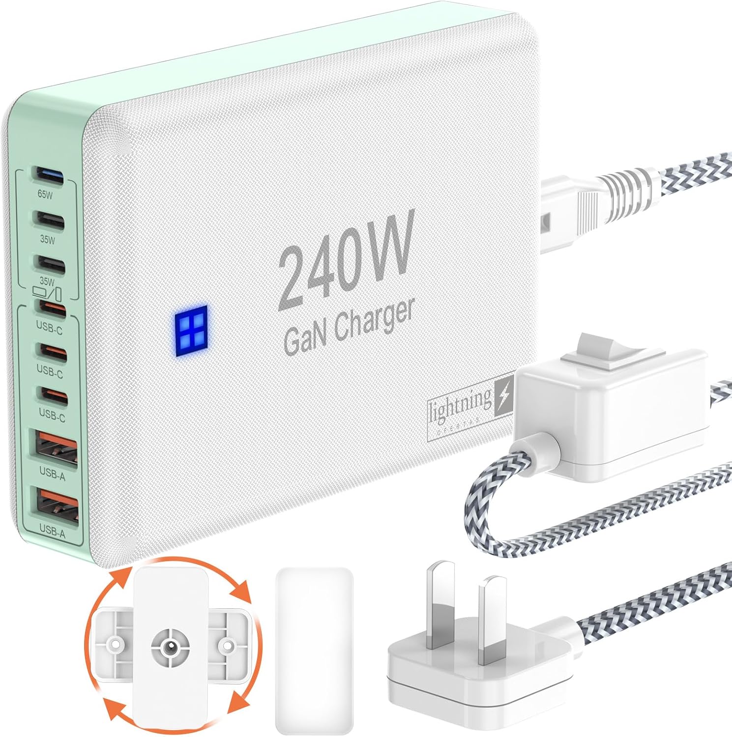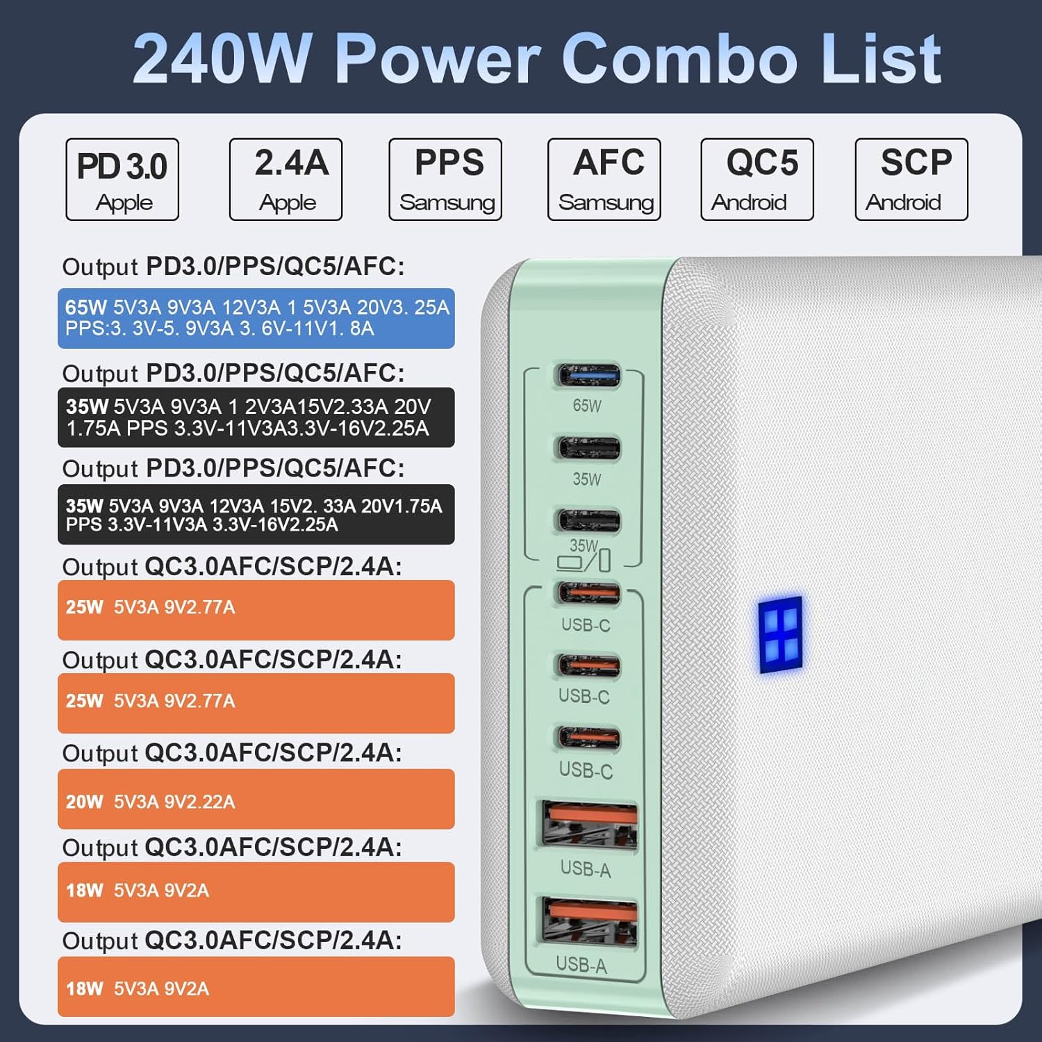 240W Fast Chargers for Multiple Devices 8 Ports, 6 Type C + 2 USB A Charger Block, Charging Station with Slim Flat Plug, 65W Power Hub for Laptops, PD GaN Charger Tower for iPhone, Samsung