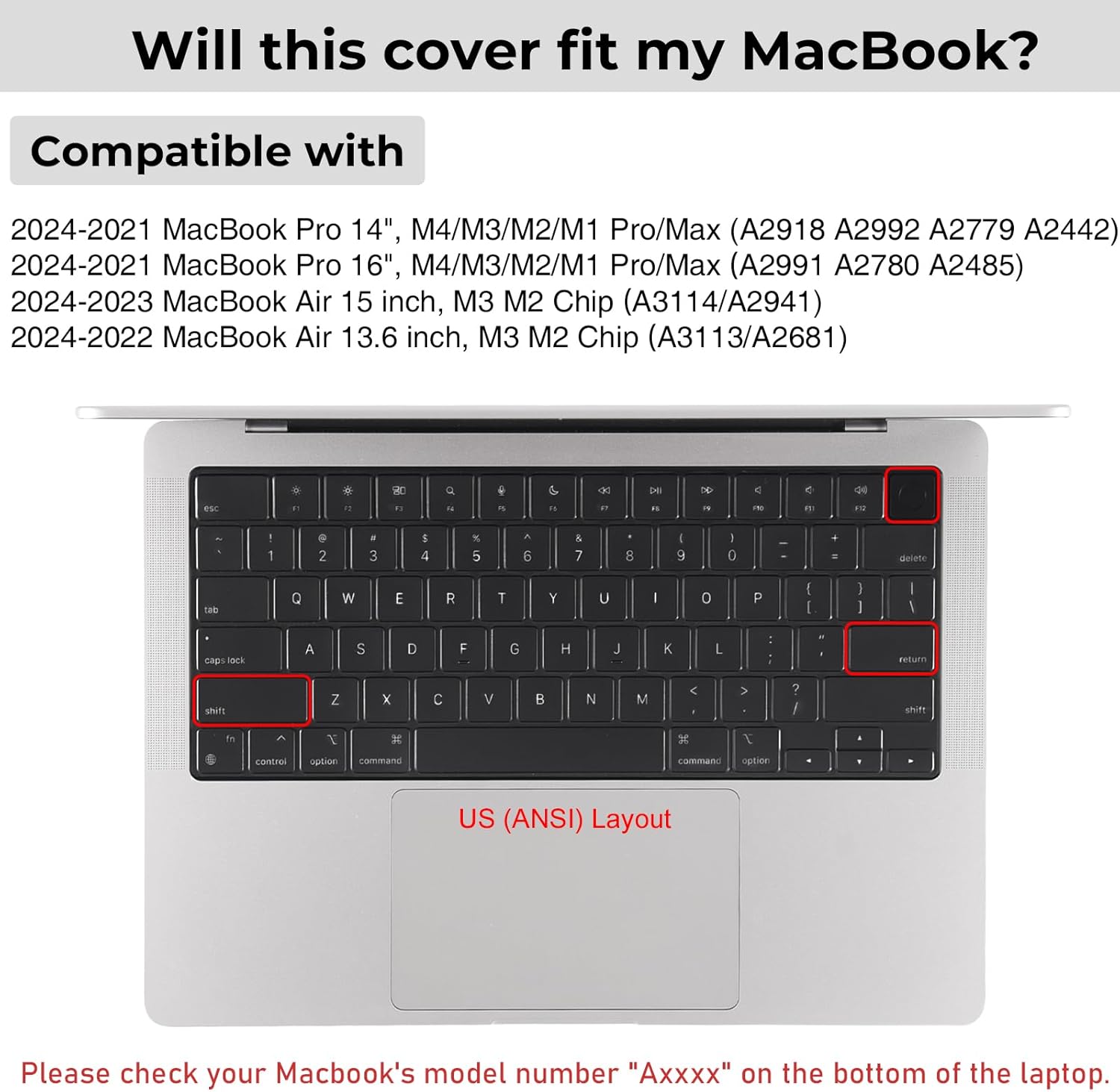 - Fit precisely compatible with MacBook Air 13.6 inch M4 M3 M2 chip 2025-2022 (model: A3240/A3113/A2681) & compatible with MacBook Air 15 inch M4 M3 M2 chip 2025-2023 (model:A3241/A3114/A3113) & compatible with MacBook Pro 14 inch M4 M3 M2 M1 Pro/Max chip 2025-2021 (model: A3112/A3185/ A3401/A2992/A2918/A2779/A2442) & compatible with MacBook Pro 16 inch M4 M3 M2 M1 Pro/Max chip 2025-2021 (model: A3403/A3186/A2991/A2780/A2485). US Keyboard Layout Only. Please check your laptop model number "Axxxx" on the bottom of the laptop