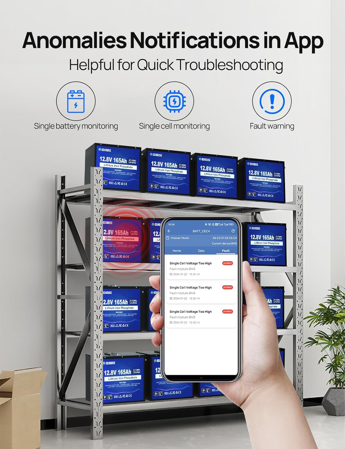 - Bluetooth APP Monitoring: DC HOUSE 12V 165AH battery has built-in Bluetooth, which can connect with DC HOUSE APP (Bluetooth signal range 5-10 meters. It is convenient to monitor battery information such as SOC, voltage, current, etc., and the data is accurate to the specific cell of a battery, there is a special fault display page to help troubleshoot