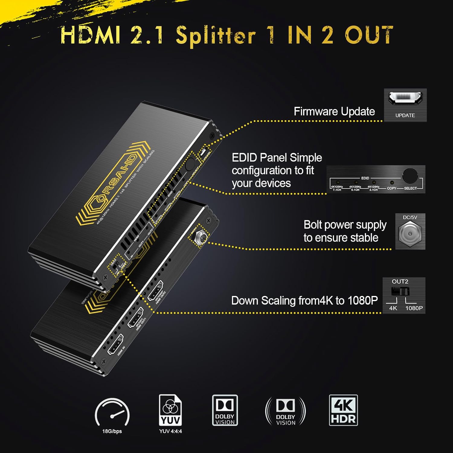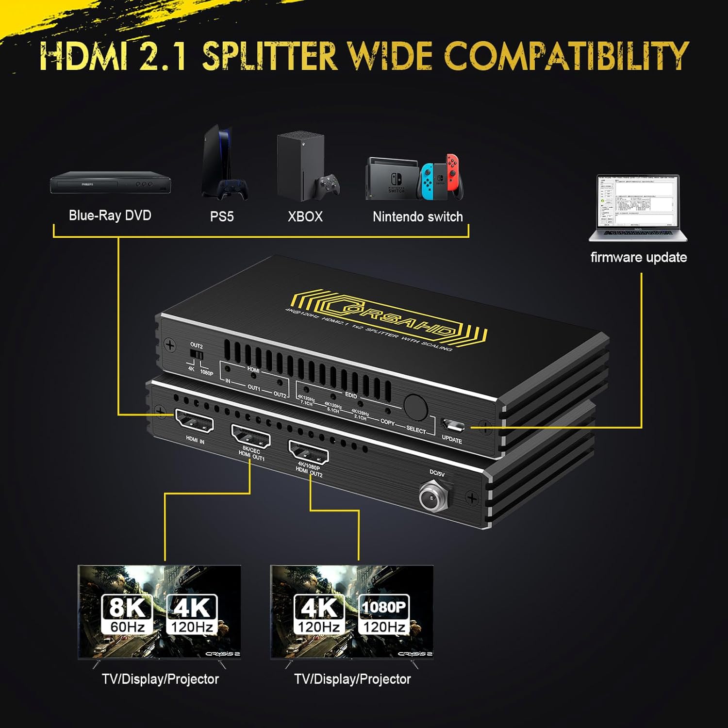 8K@60Hz 4K@120Hz HDMI 2.1 Splitter 1 in 2 Out,48 Gbps,HDCP 2.3,Supports VRR,ALLM,HDCP Bypass,EDID,Duplicate/Mirror/Copy,Downscale,HDR,Dolby Vision Atmos,Soundbar
