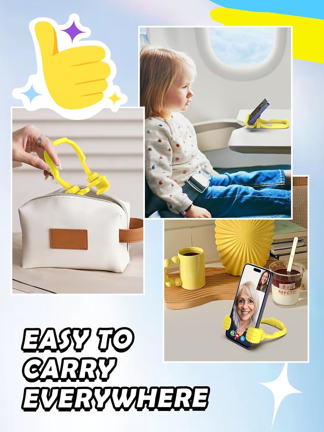 - [Upgraded 360° Flexible Adjustable Universal Compatibility] The thumb-up phone holder boasts a unique universal head that can rotate 360°, allowing for both horizontal and vertical placement. Adjust the phone's tilt angle by moving the thumbs up or down, accommodating most phones and tablets. With its thickened and widened design, this versatile phone stand unlocks numerous holder methods, adaptable to most devices & phone cases. Adjust various angles at will to obtain the best perspective