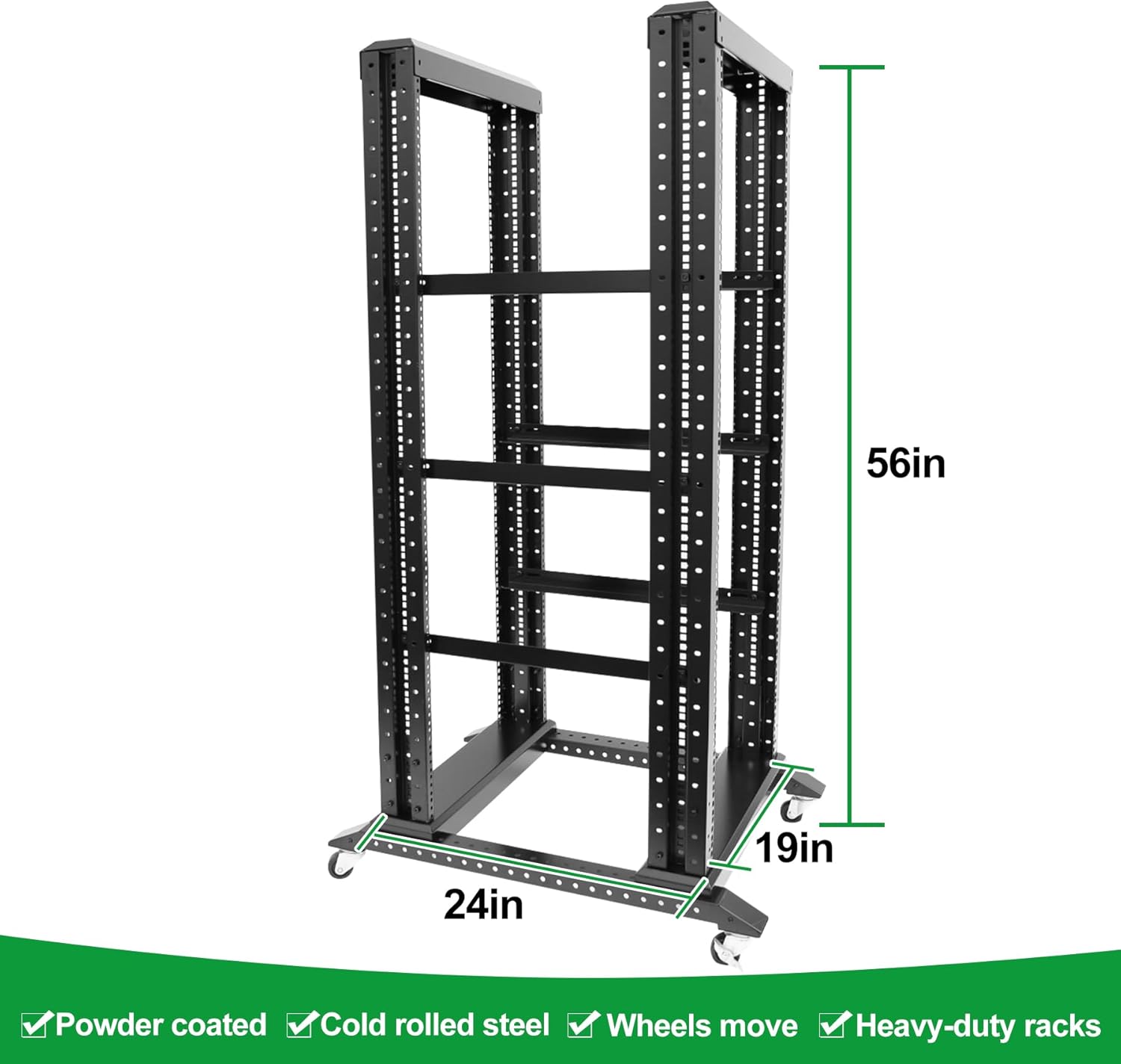 - Specifications:GLOBALRACK 4-post open frame server rack ,Network rack that complies with all 19-inch standard equipment.Installation depth 24-22in,Equipped with brake wheels,Compatible with various servers, switches, data, AV, other IT equipment.