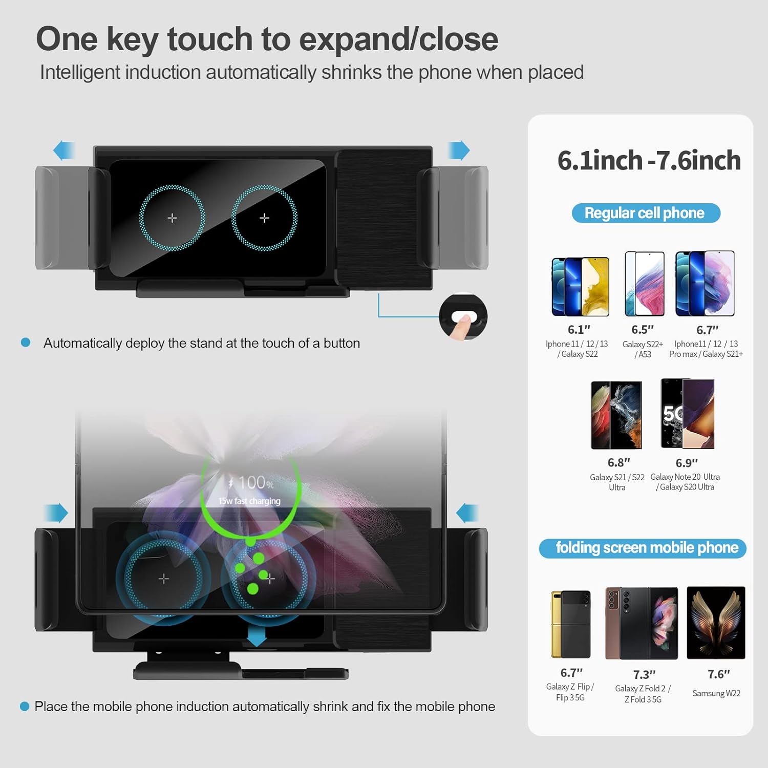 - 【Z Fold 6 Car Mount】This wireless car charger mount is newly upgraded, the expandable base has wide compatibility and perfectly fits cup holes between 2.6-4.0 inches in diameter. This cup holder phone mount is strong neck, which stops any shaking. A flexible swivel ball for 360° rotation and a jointed arm for 270° easy movement further enhance your view of the phone. It ensures safe driving whether you are talking, navigating, listening to music or charging