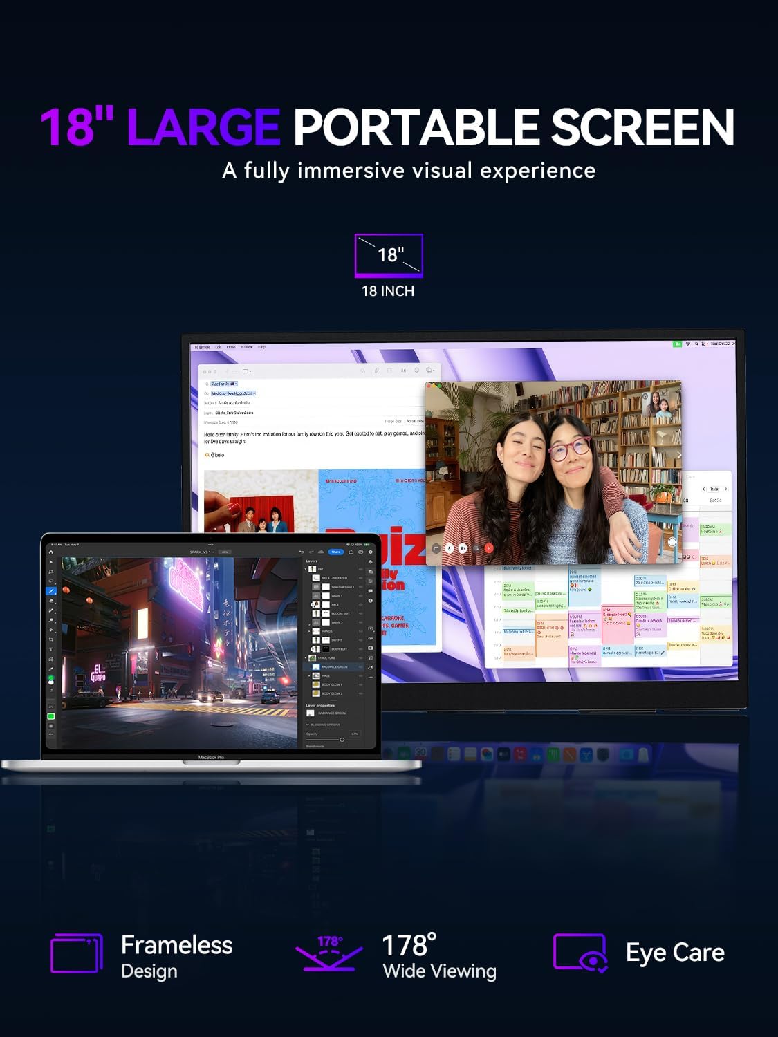 - Superb 18-Inch Portable Display: Enjoy a large 18-inch screen with a sleek, frameless design, ideal for immersive gaming and productivity while remaining highly portable