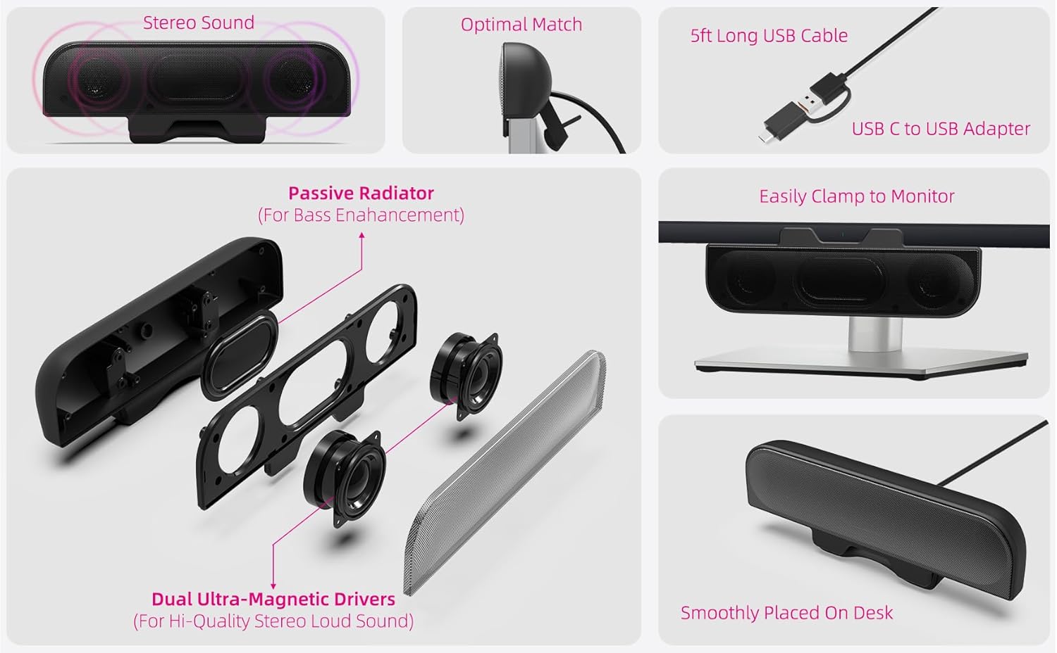 Computer Speakers for Desktop PC, Monitor Speakers, USB Plug-in, Wired, External Speaker for Laptop, Small Computer Soundbar for PC, with Loud Sound, Deep Bass, USB-C Adapter, Easily Clamp to Monitor