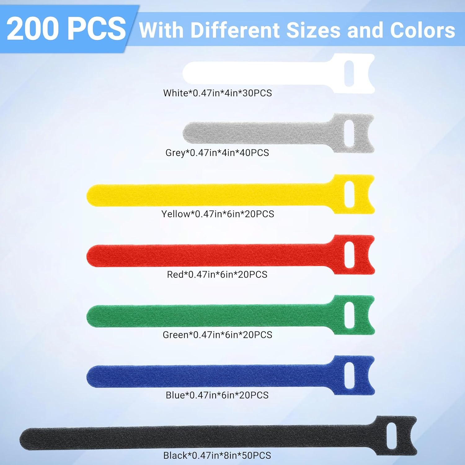 - 200 PCS VALUE PACK: Our pack includes 200 pieces of reusable zip ties in 7 colors and 3 sizes:70 pcs of 4-inch, 80 pcs of 6-inch and 50 pcs of 8-inch.With vivid colors to choose, you can manage wires neatly. Different colors for different needs. Use them to declutter and categorize your cables