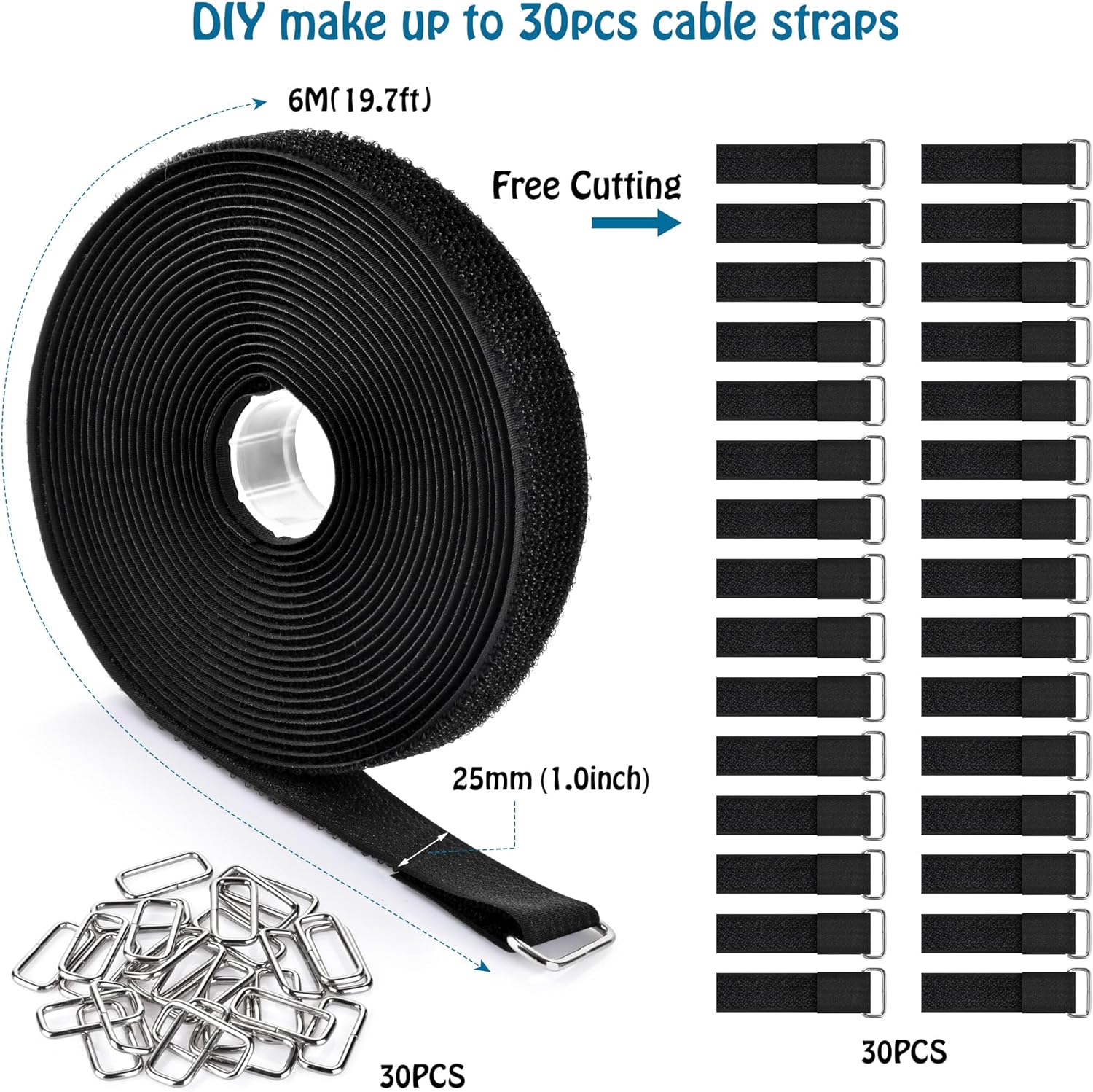 1"x19.7ft Hook and Loop Straps with 30 Buckles Adjustable Cut-to-Length Cable Ties - Reusable Nylon Fastening Tape Cable Straps for Storage or Organization (1in x 19.7ft)