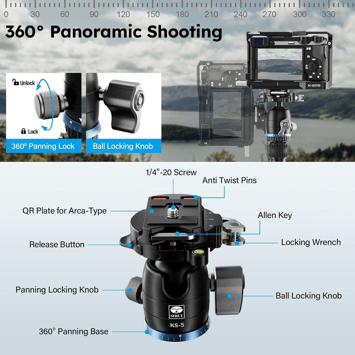 SIRUI Carbon Fiber Travel Tripod - Lightweight 55.1" Compact Tripod with 360° Panorama Ball Head, Quick Release Plate (AM-025K+KS-5)