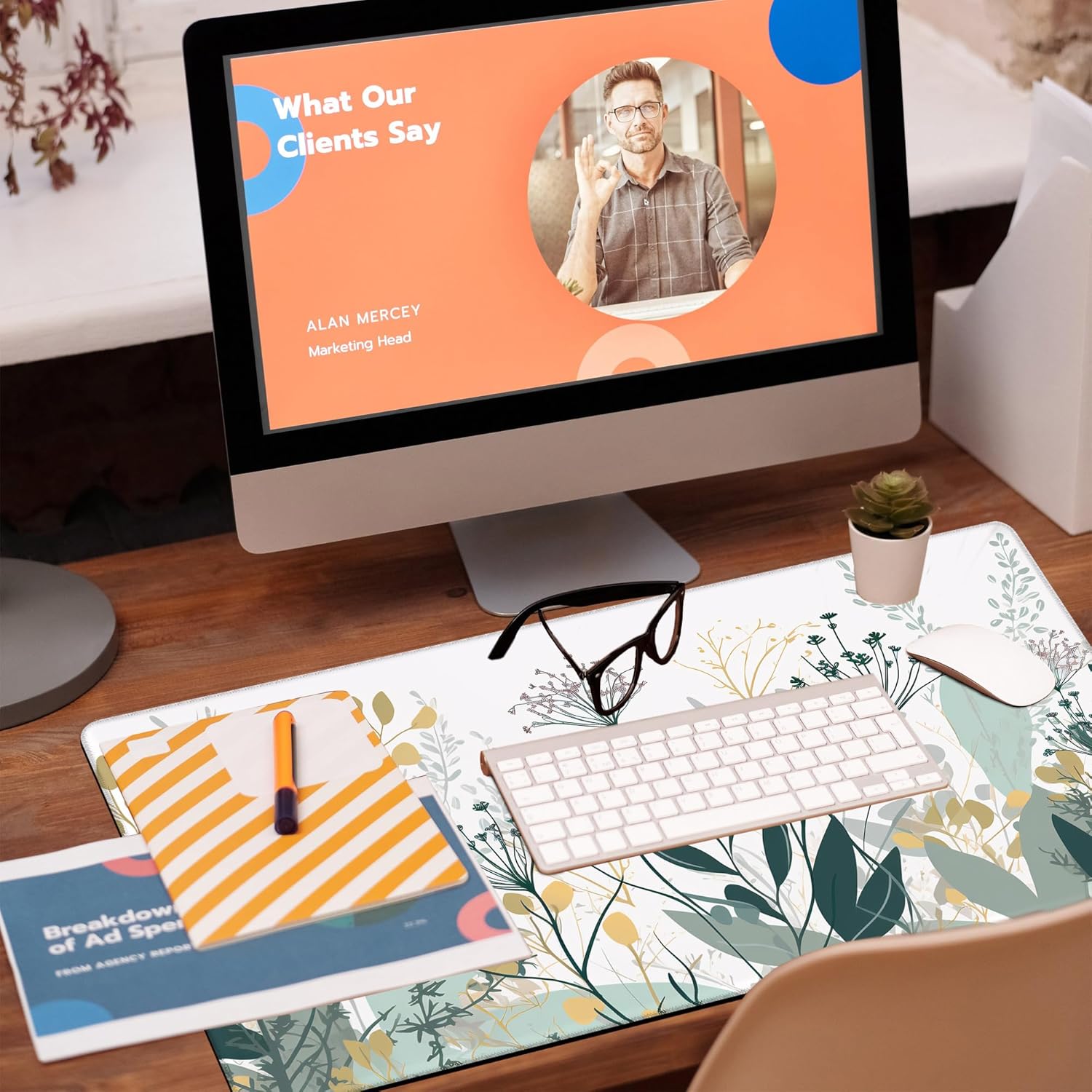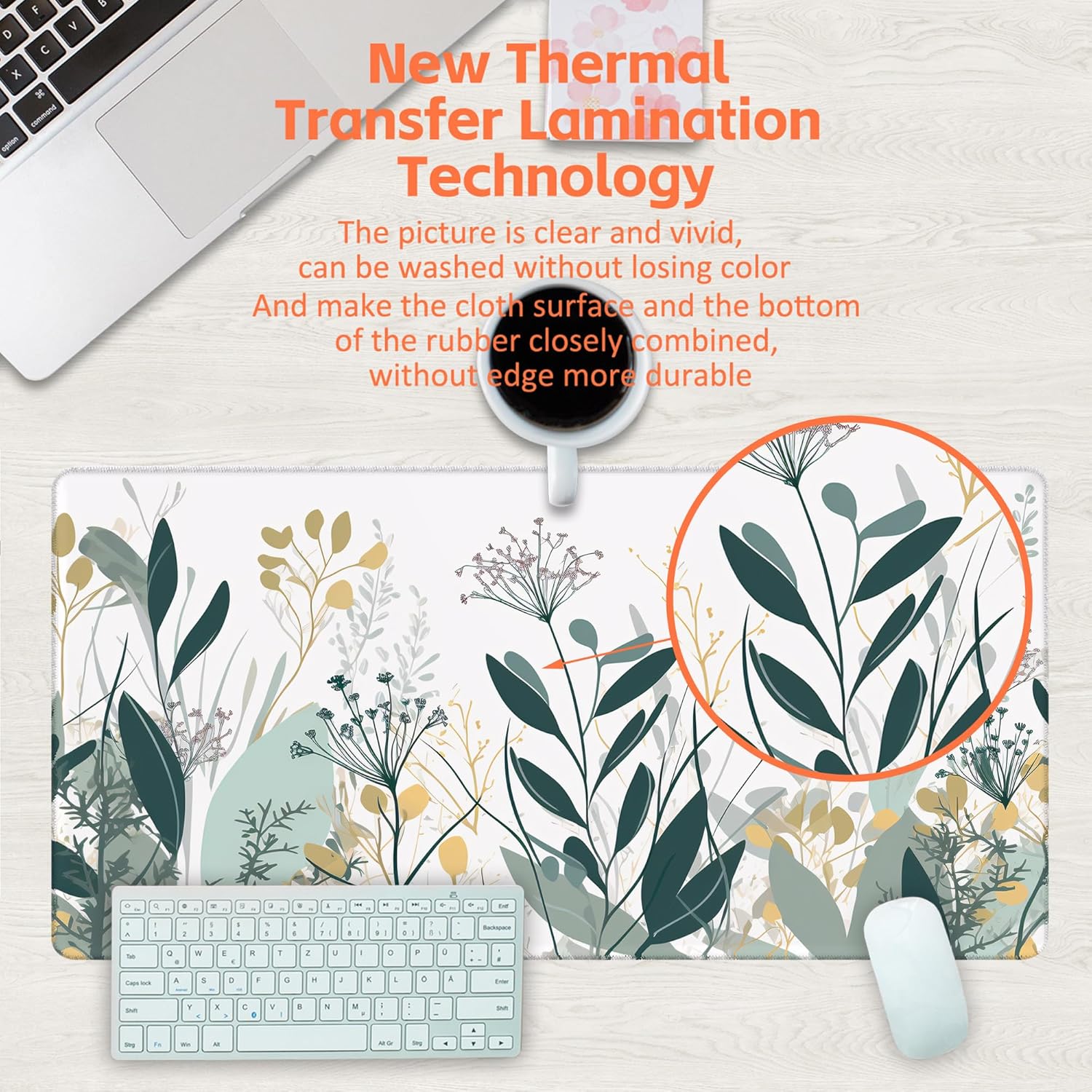 Desk Mat, Green Gold Plant Leaves Desk Pad, Wildflowers Large Gaming Mouse Pad for Desk, 31.5"x15.7" Extended Big Computer Keyboard Mouse Pad with Non-Slip Base and Stitched Edge