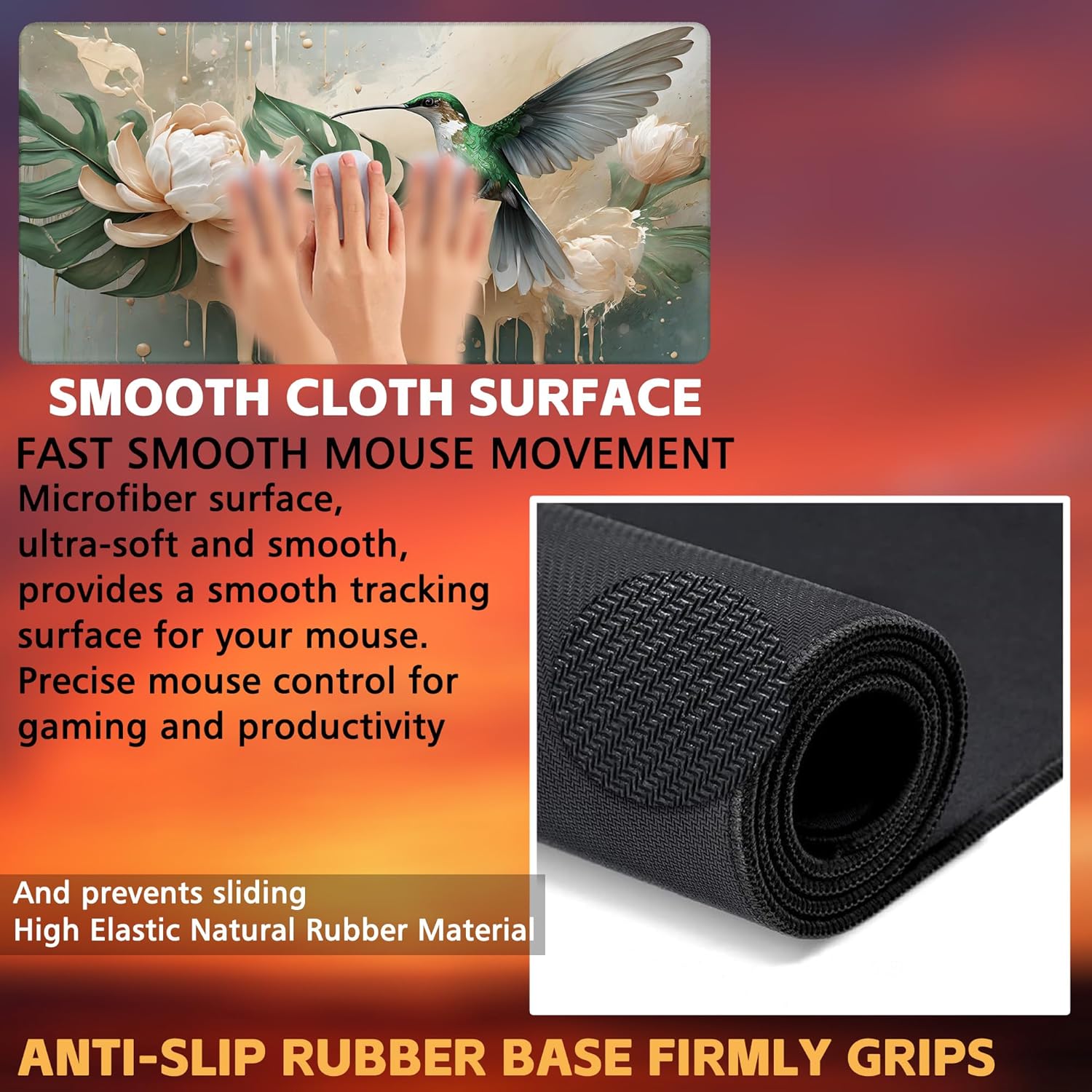 Desk Pad, Elegant Hummingbird Desk Mat, Oil Painting Flowers and Leaves Large Gaming Mouse Pad, 31.5"x15.7" Extended Big Computer Mouse Pad with Non-Slip Base and Stitched Edge