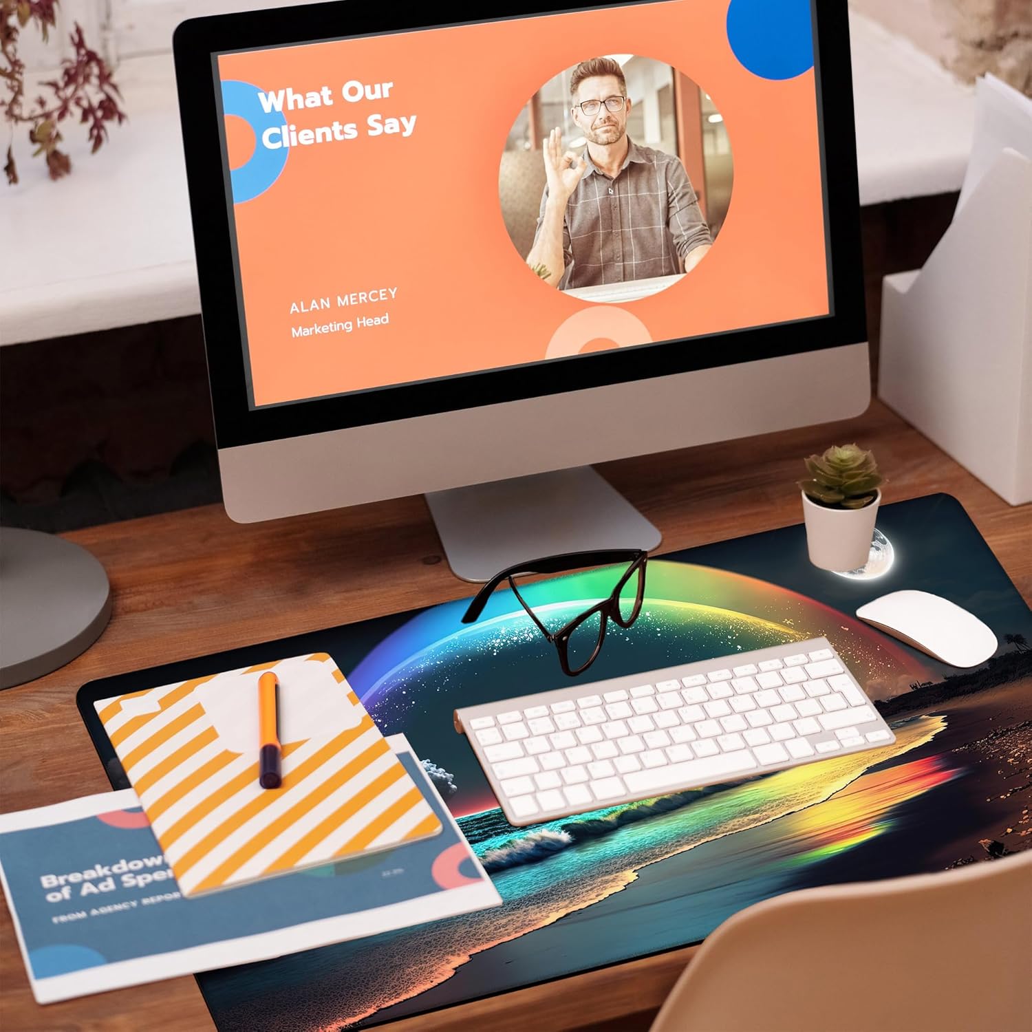 Desk Mat, Rainbow and Full Moon Desk Pad, Beach at Night Large Gaming Mouse Pad for Desk, 31.5"x15.7" Extended Big Computer Keyboard Mouse Pad with Non-Slip Base and Stitched Edge