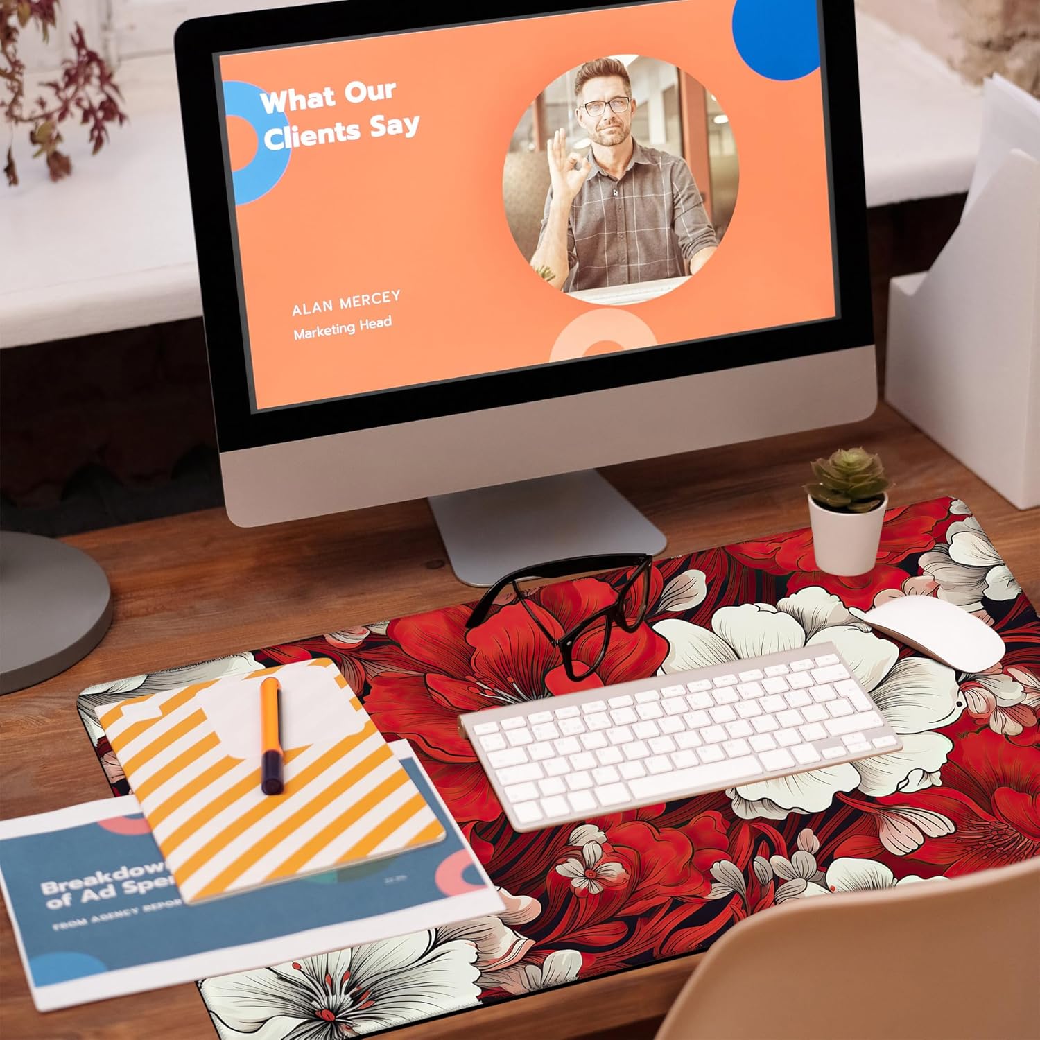 Desk Pad, Red and White Flowers Desk Mat, Retro Red Floral Large Gaming Mouse Pad, 31.5"x15.7" Extended Big Computer Keyboard Mouse Pad with Non-Slip Base and Stitched Edge
