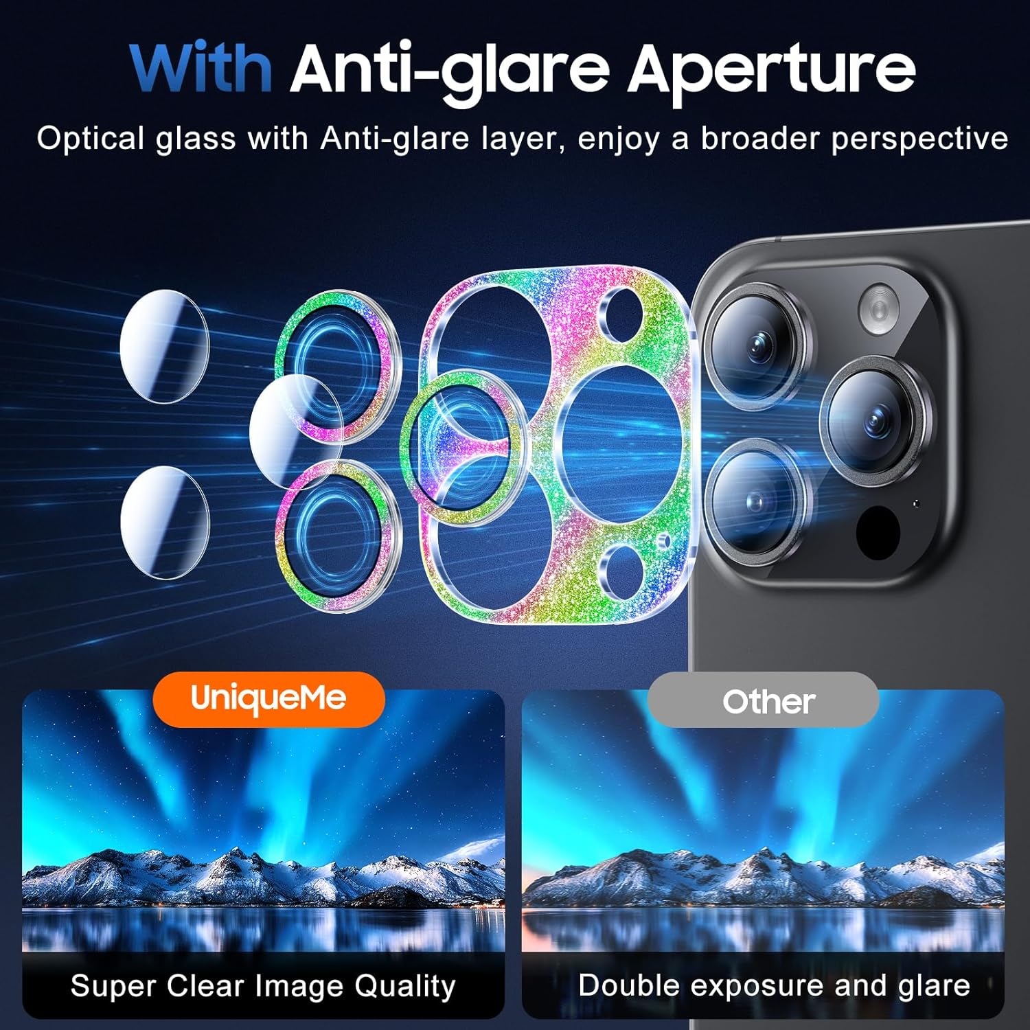 - 【4th Gen Upgraded Protection Design】UniqueMe iPhone 16 Pro / 16 Pro Max Camera Lens Protector has been designed to provide durable and effective protection for the camera lens. It has been upgraded to its 4th-Generation integrated version with Anti-glare Aperture and an Electroplated Sapphire Super Hard AF film camera protector screen.