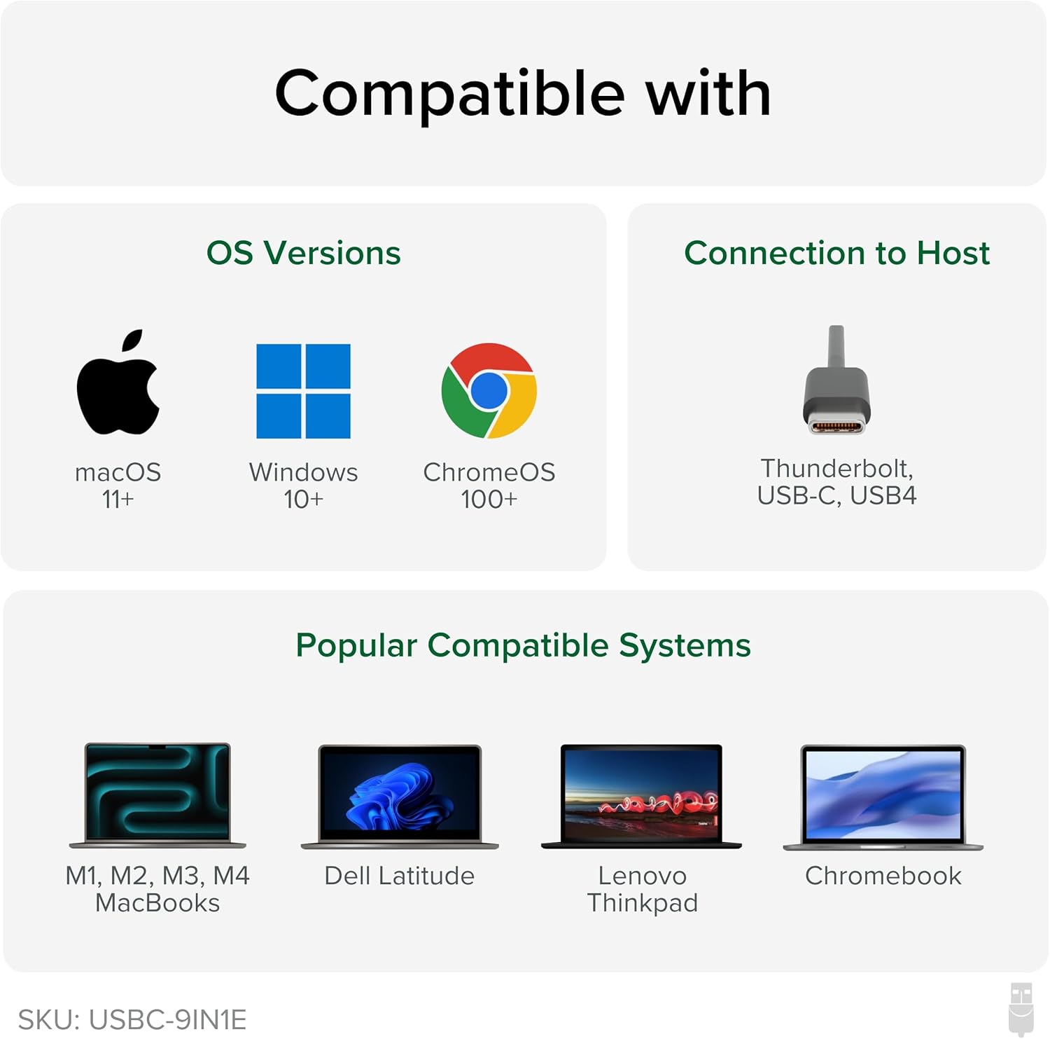 - Compatible Devices : Supports full-featured USB-C, USB4, and Thunderbolt 3 / Thunderbolt 4 systems running Windows 10 / 11 & ChromeOS 100 or newer & macOS 11 and later including, M1/M2/M3-based MacBooks (Base models and Pro / Max models), Intel-based Thunderbolt 3 MacBooks (late 2016+), HP ProBook / EliteBook / Spectre x360 series, Dell XPS / Latitude / Inspiron series, Lenovo ThinkPad / IdeaPad / Yoga , Microsoft Surface Pro / Go / Book / Laptop models, LG Gram, iPhone 15 / 15 Pro, 16 / 16 Pro, iPad Pro, Air, and mini, Thousands of other laptops which are compliant with full-featured, standards-compliant USB-C ports Supports full-featured USB-C, USB4, and Thunderbolt 3 / Thunderbolt 4 systems running Windows 10 / 11 & ChromeOS 100 or newer & macOS 11 and later including… See more
