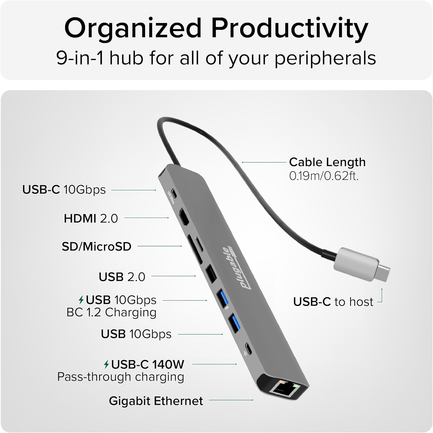 - Why Choose This 9-in-1 Hub: In a cushy office, cramped home office, or on the go, the Plugable USB-C Hub is preferred by productive people for its 4K 60Hz HDMI, 10Gbps USB-C, USB 2.0 port, 2x USB-A 10Gbps ports (one with BC 1.2), SD, MicroSD (UHS-II), Gigabit Ethernet, built-in 7.48″ USB-C cable, and most impressive, 140W pass-through charging (that’s a lot).