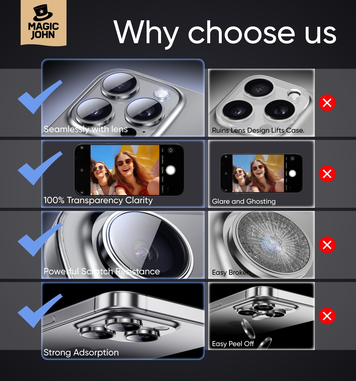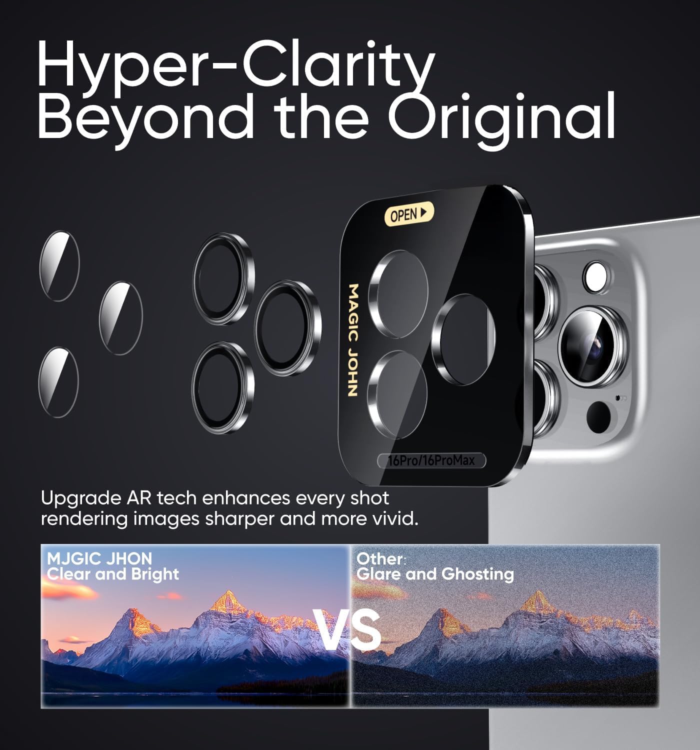 - [High-reduction Photography] MAGIC JOHN camera lens protector with upgraded sapphire material, 99.99% optical-grade light transmittance, AR anti-reflection technology which produces the same shooting results as the original iphone 16pro/16promax camera.