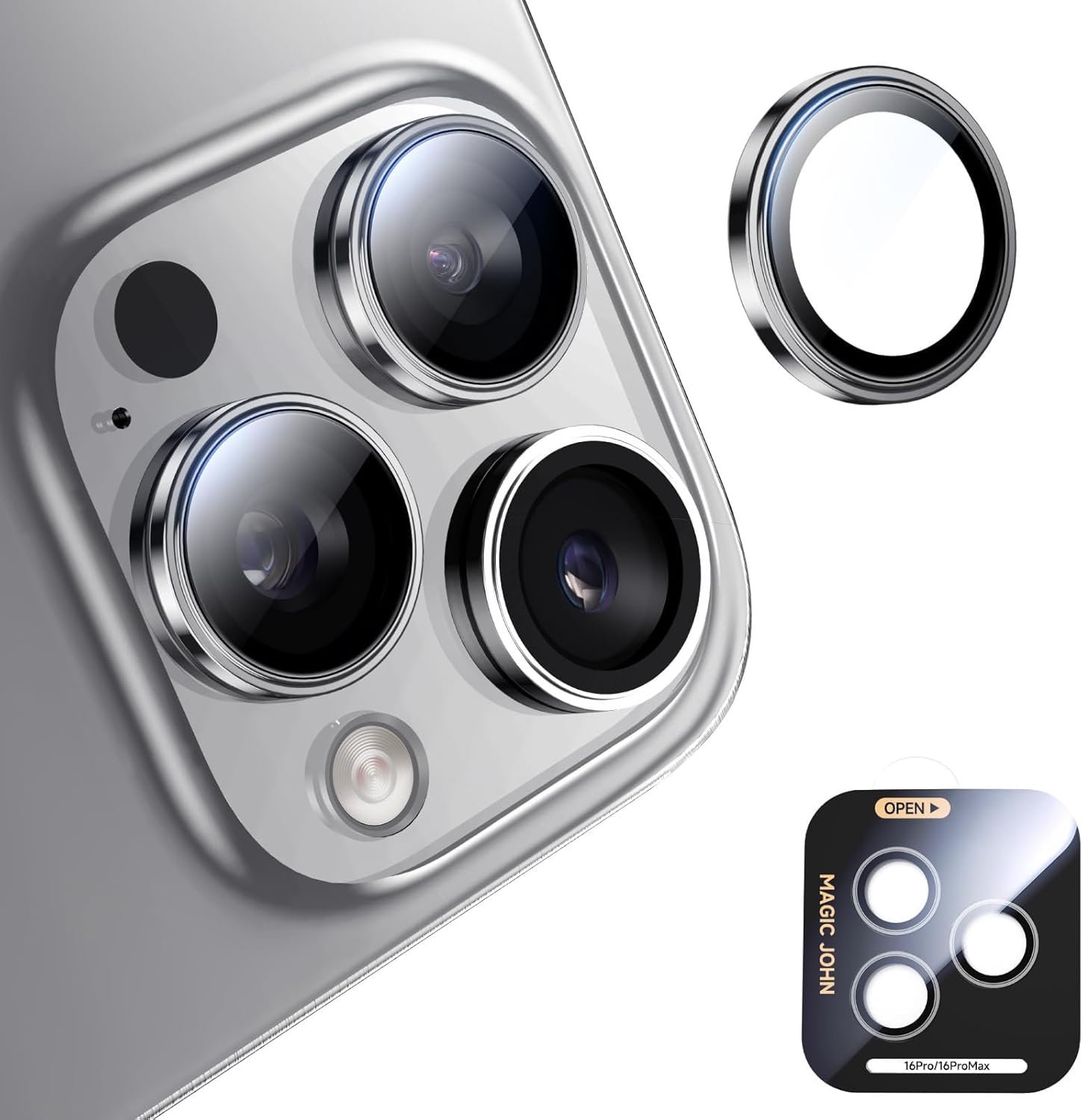 MAGIC JOHN for iPhone 16 Pro Max/16 Pro Camera Lens Protector [Alignment Kit&1:1 Invisible Perfect Fit] 9H Aerospace Tempered Glass Anti-Scratch Durable, Individual Cover Ring, Case Friendly, Set of 2, Silver