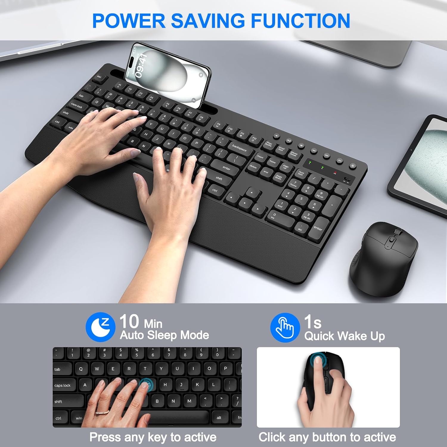 - 【POWER SAVING FUNCTION】: The wireless mouse and keyboard combo has the function of automatically entering the power-saving, when you stop using the keyboard and mouse combo more than 10 mins, they will enter sleep mode respectively to save power, press any button or key to wake up