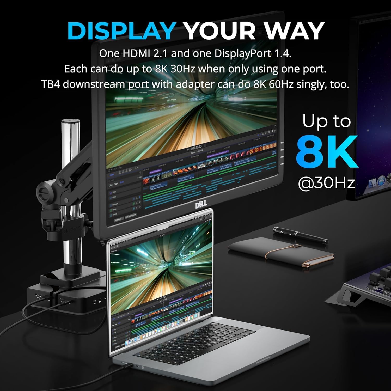 - Display Wide: Output to your displays with DP 1.4 and HDMI 2.1 ports at up to 8K@30Hz or the TB4 port at up to 8K@60Hz/4K@144Hz (DSC) with HDR & HDCP2.3 support. Dual and triple (Windows) display output at up to 4K@60Hz is possible with MST hosts.