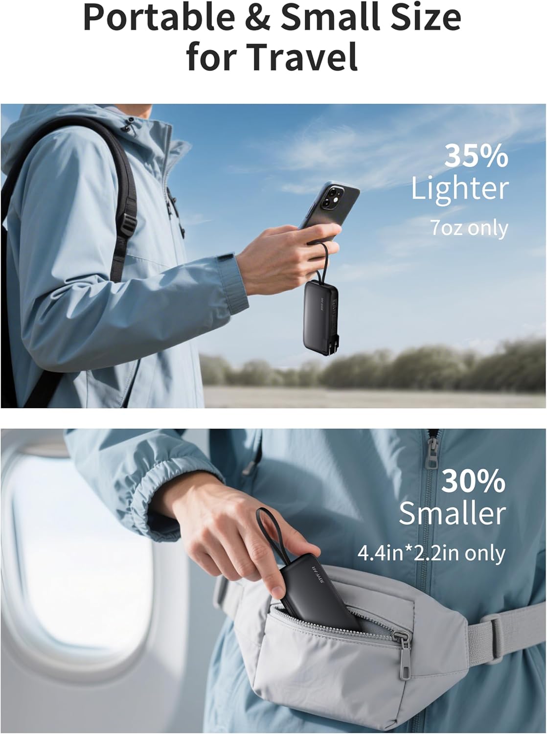 - The Market’s Smallest 10,000 mAh AC Plug Portable Charger: At just 4.4x2.2x1.2" and 7oz, it’s 30% smaller than your phone and 35% lighter than other power banks — slips effortlessly into pockets or bags. It fuels your iPhone 15 1.97 full charges or Samsung S23 1.84 times, the smart LCD display shows exact battery levels, perfect for all-day work, cross-country flights, or camping trips