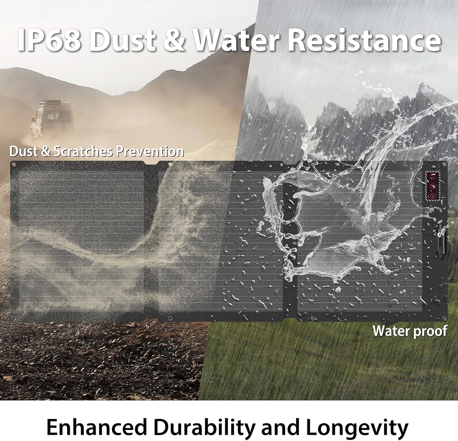 - DURABLE & WIDE USE: The 200 Watt foldable solar charger utilizes ETFE coating material and is made of high quality IP68 waterproof oxford fabric, which is not only waterproof but also dustproof, long-lasting durability and hard-wearing. The portable solar panels can withstand light rain and snow as well as perfect for outdoor activities such as camping, hiking, picnics, caravan, RV, car, boat, off-grid living and unexpected power outages. However, the output control box is not waterproof,in order to prolong the lifespan of 200watt solar panel, please don't soak it into water.