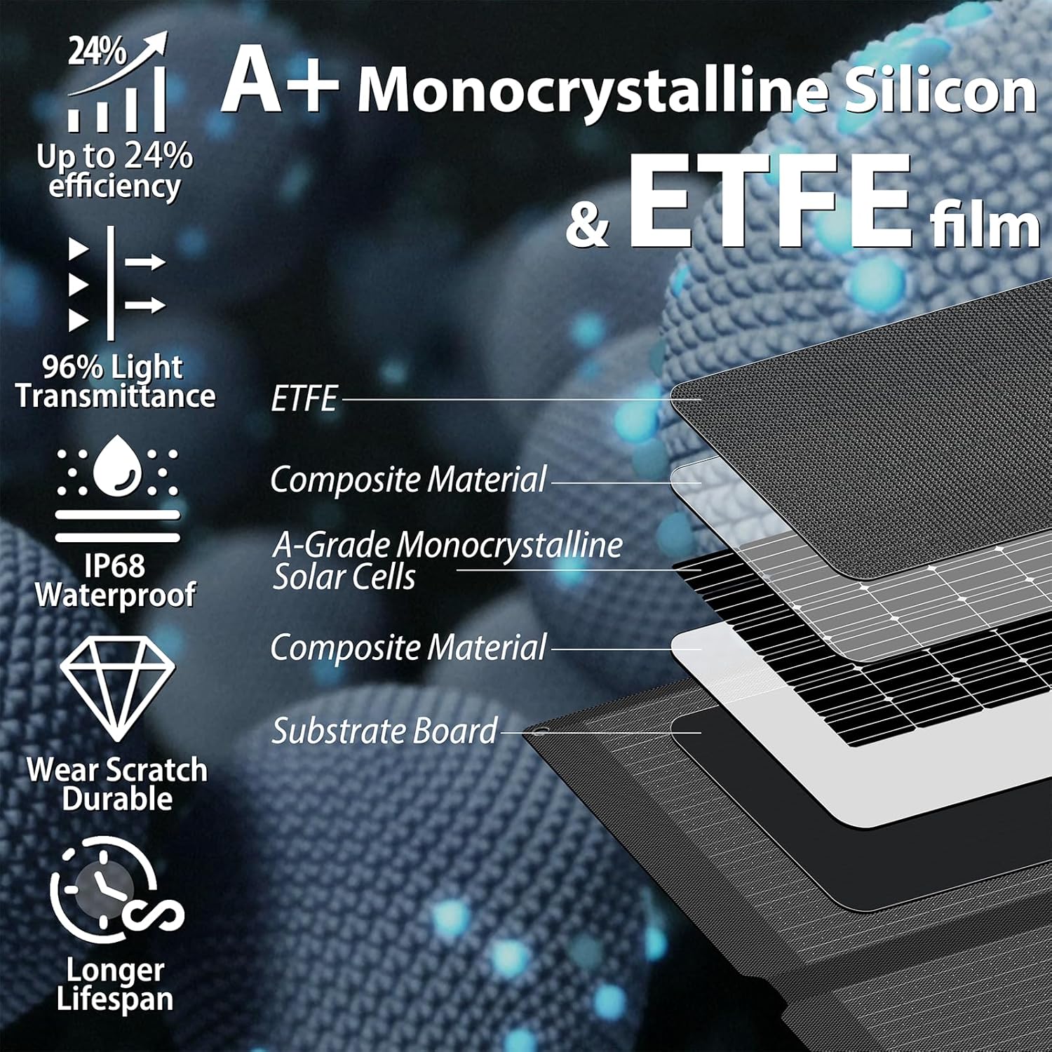 - Material : Monocrystalline Silicon, ETFE, Aluminum