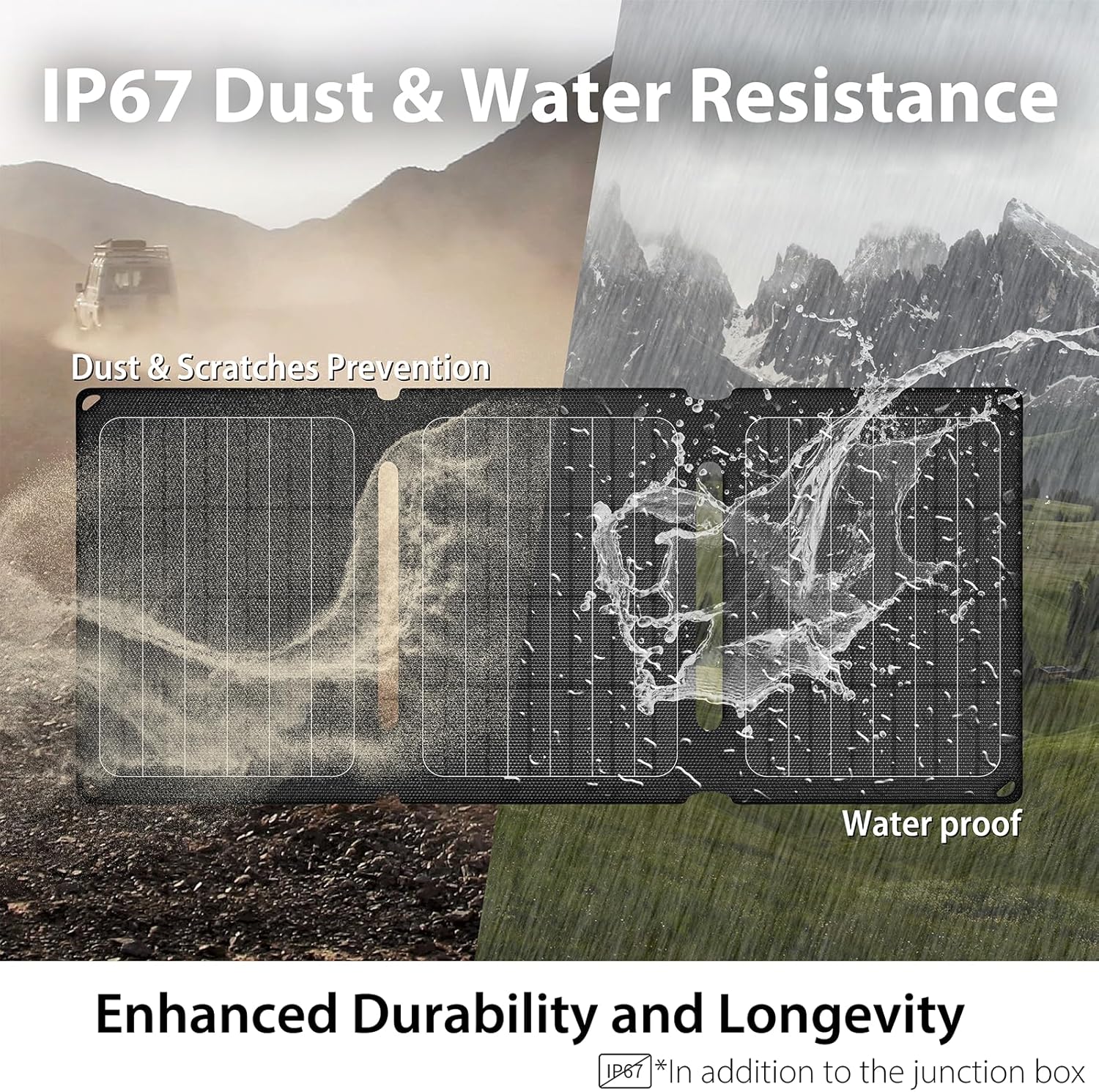 - 【Waterproof & Durable】 Advanced ETFE lamination technology, with a layer of heat-resistant and dustproof waterproof film on the surface, prevents the battery from being damaged by moisture and sunlight, making it more durable, scratch-resistant and moisture-resistant. It is lP65 waterproof, which will protect it from water splashes, and withstand all kinds of weather conditions, making it ideal for outdoor adventures. (Please keep the USB port dry).