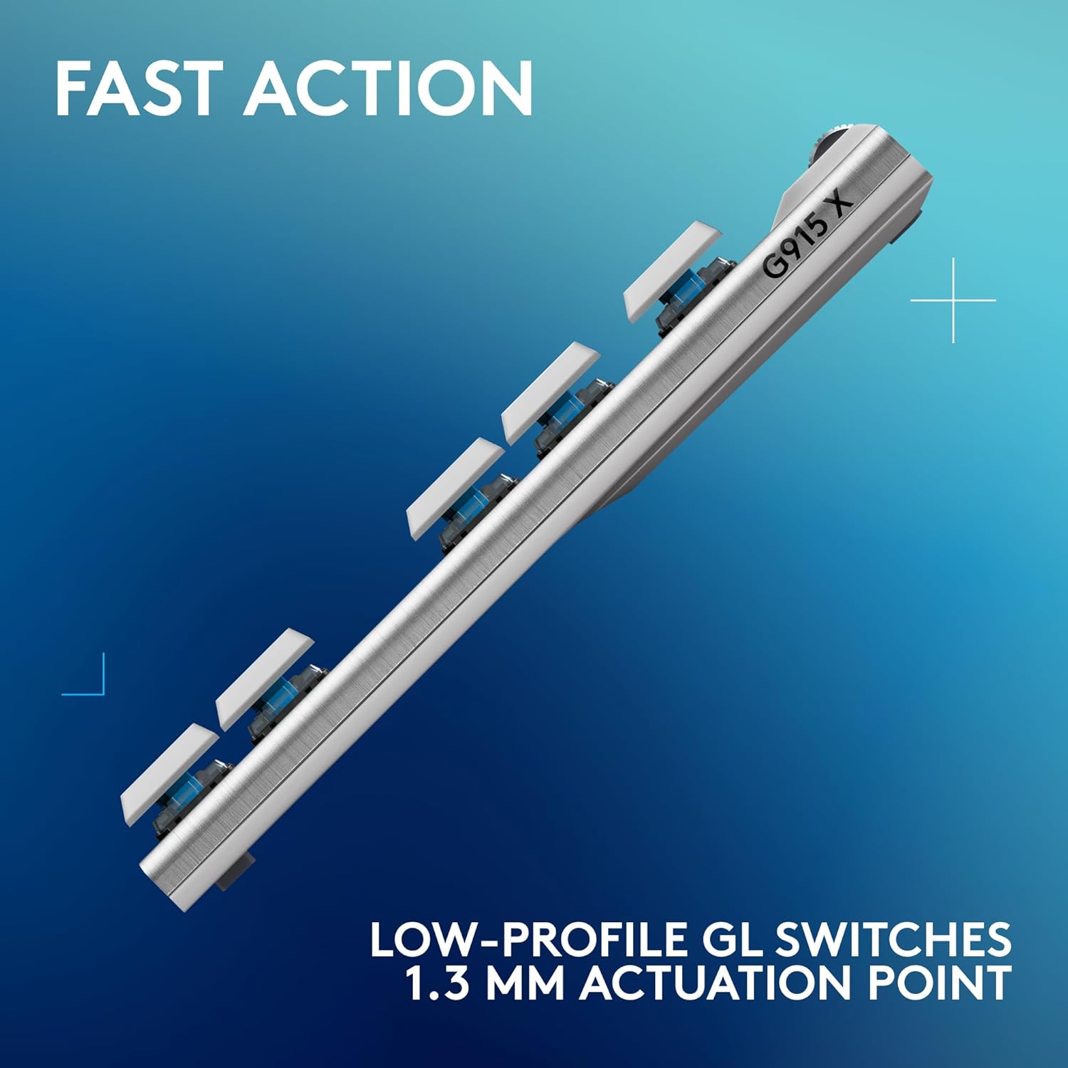 - Speed, Precision & Comfort: Achieve all three with this low profile mechanical keyboard with GL switches. The G915 X Tenkeyless keyboard offers increased APM (actions per minute) rate with 1.3mm actuation point & 3.2mm total travel distance