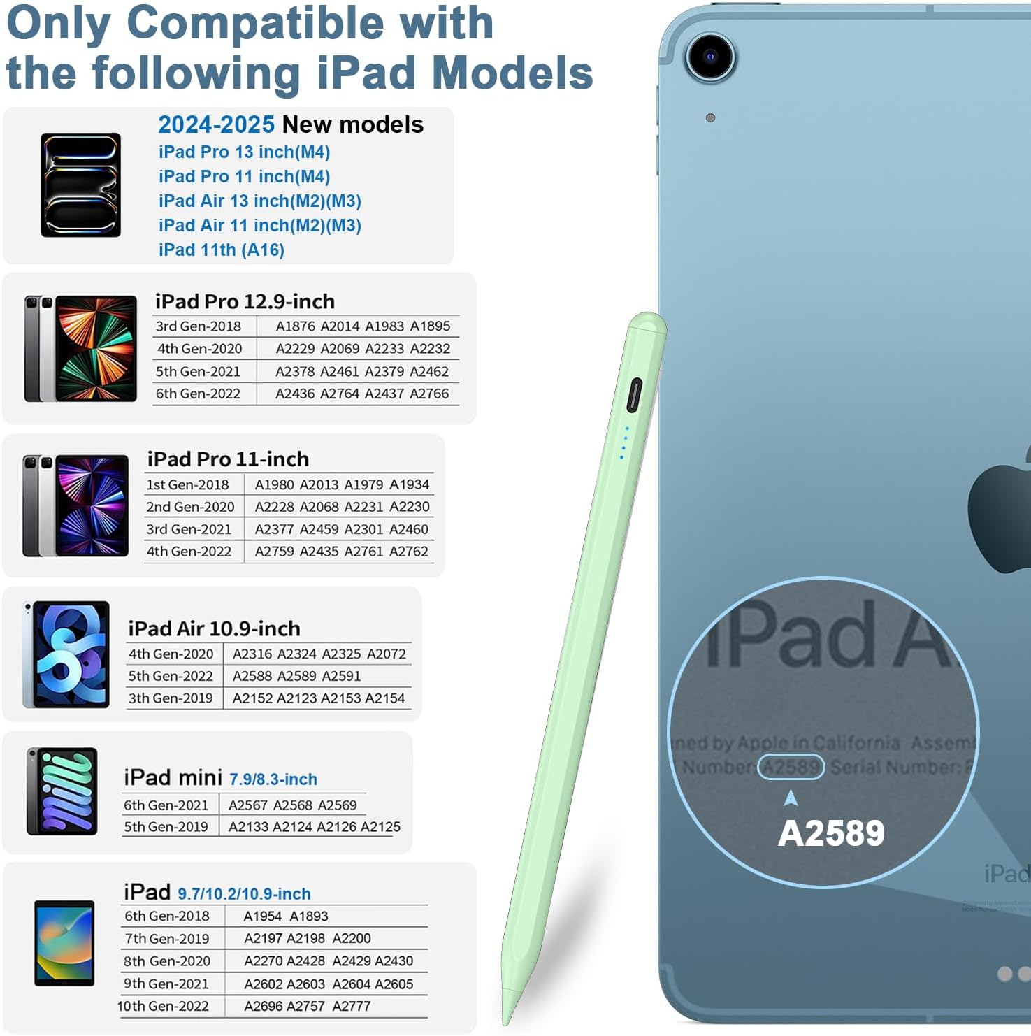 Stylus Pen for iPad 9th&10th - Type-c Charging Pencil for ipad Palm Rejection Active Pen Compatible with (2018-2025) Apple iPad 6/7/8/9/10/11(A16), Air 3/4/5/M2/M3, Mini 5/6, Pro 11"/12.9"/M4(Green)