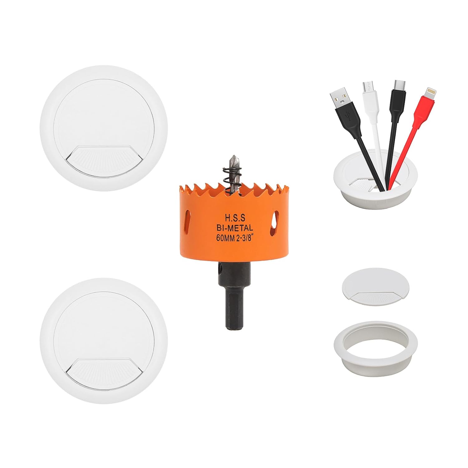 Desk Grommet 2-3/8 inch with Hole Saw, Desk Cord Hole Cover Grommet for Cables, 2 PCS, White