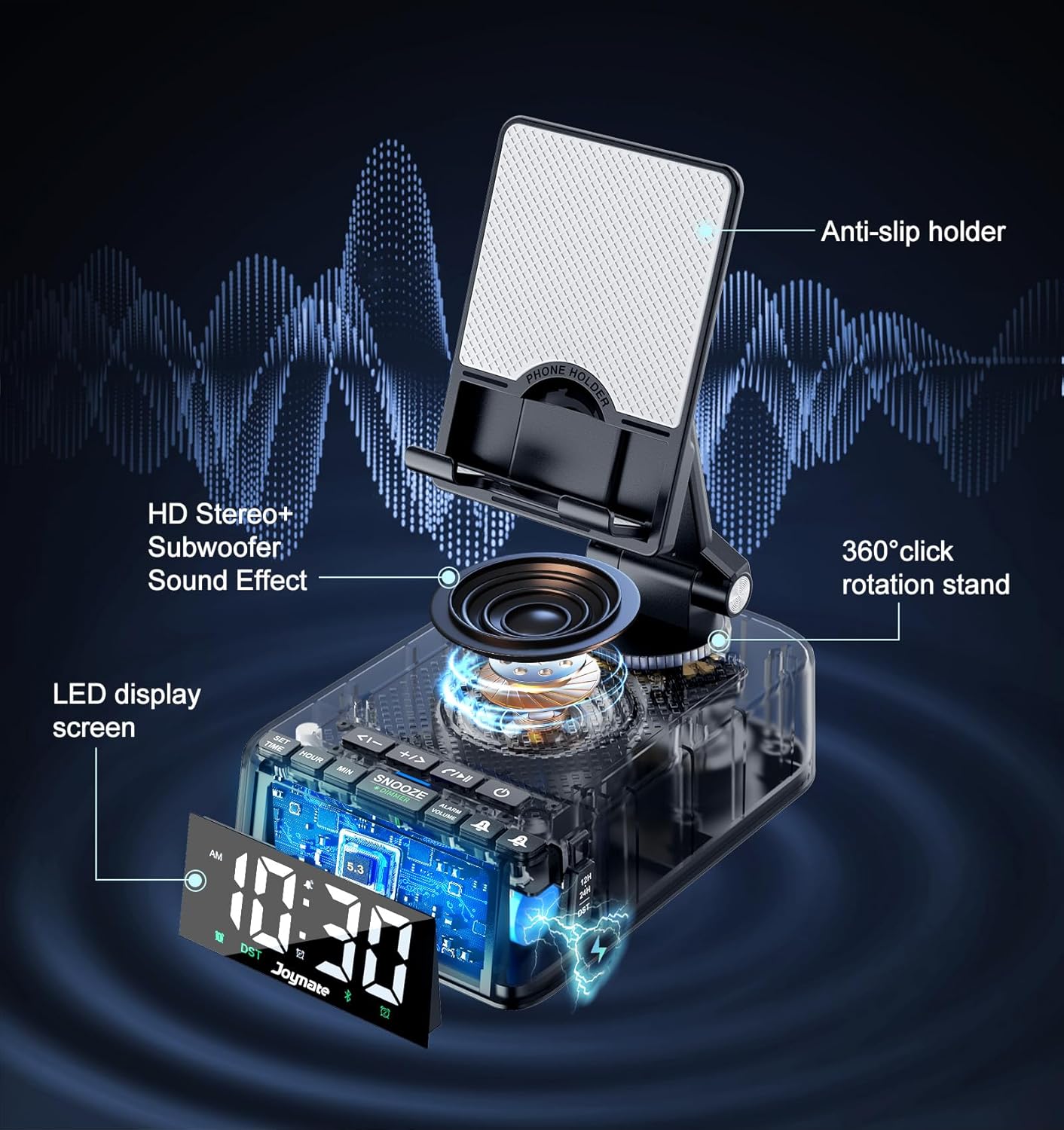 - Bluetooth 5.3 and HD Stereo Subwoofer Speaker - We adopted Bluetooth 5.3 technology to ensure a stable and quick connection with your phone which far range up to 32.8ft. Stereo and subwoofer sound perform well with clear highs and bass with less distortion, well immerse yourself in the plot or music. (Please note: it is not a charging stand.)