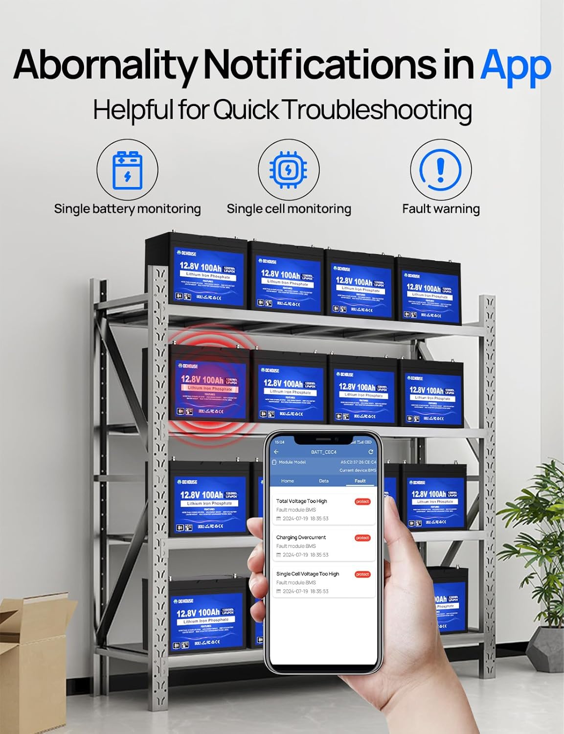 - Bluetooth APP Monitoring: DC HOUSE 12V100AH battery has built-in Bluetooth, which can connect with DC HOUSE APP (Bluetooth signal range 5-10 meters. It is convenient to monitor battery information such as SOC, voltage, current, etc., and the data is accurate to the specific cell of a battery, there is a special fault display page to help troubleshoot