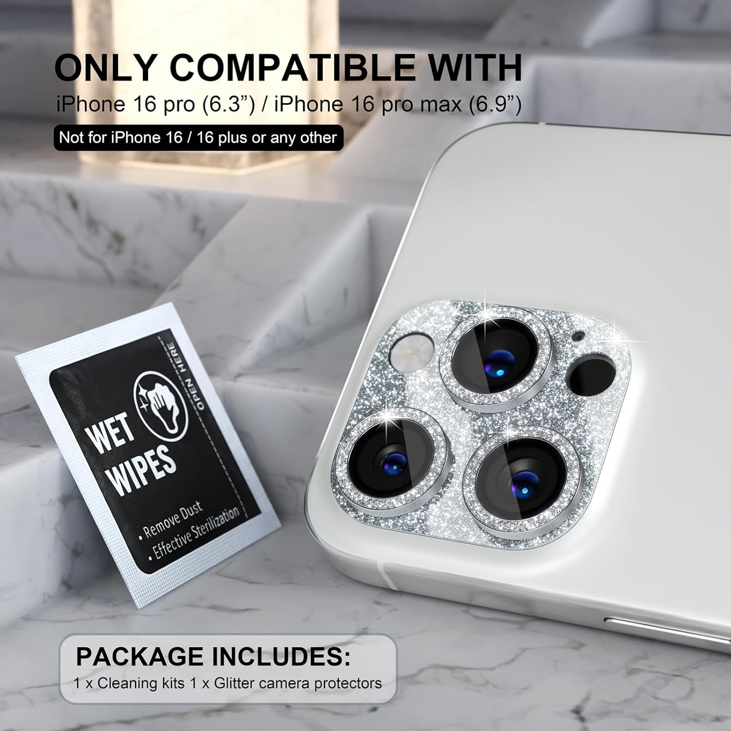 - Bling Camera Lens Protector: We present new upgrade smartphone rear camera lens Protectors which are perfectly compatible for iPhone 16 Pro Max 6.9-inch & iPhone 16 Pro 6.3-inch 2024 released. The package contains a set of delicate camera lens protectors and a set of cleaning kits. Please confirm the iPhone models carefully before purchase.