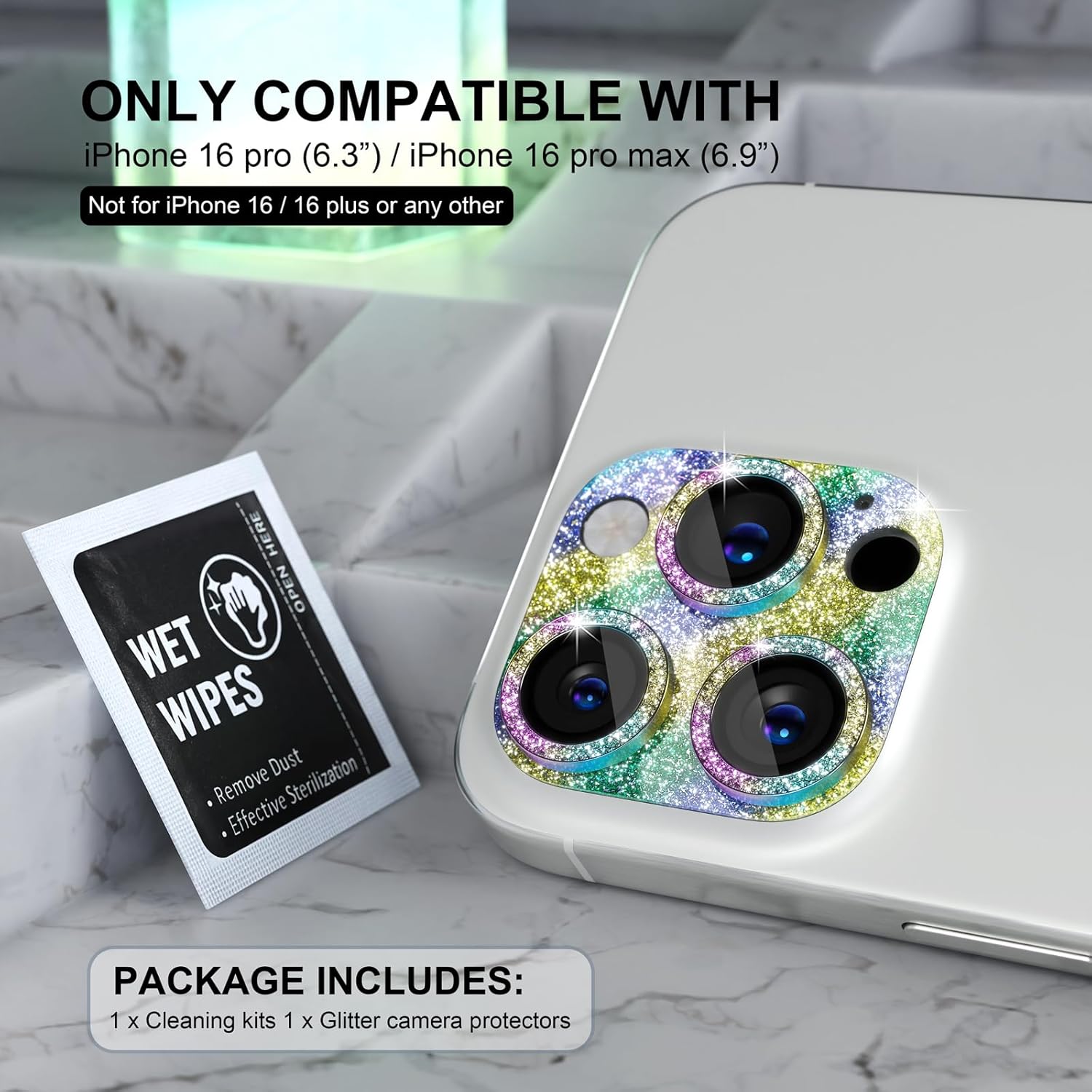 - Bling Camera Lens Protector: We present new upgrade smartphone rear camera lens Protectors which are perfectly compatible for iPhone 16 Pro Max 6.9-inch & iPhone 16 Pro 6.3-inch 2024 released. The package contains a set of delicate camera lens protectors and a set of cleaning kits. Please confirm the iPhone models carefully before purchase.
