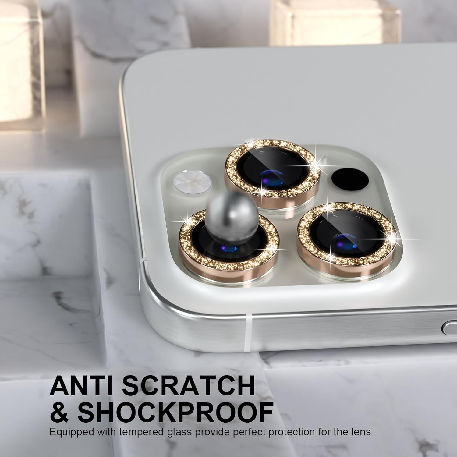 Choiche Compatible for iPhone 16 Pro/iPhone 16 Pro Max Camera Lens Protector Bling, 9H Tempered Glass Camera Cover Screen Protector Metal Ring Decoration Accessories (Glitter-Gold)
