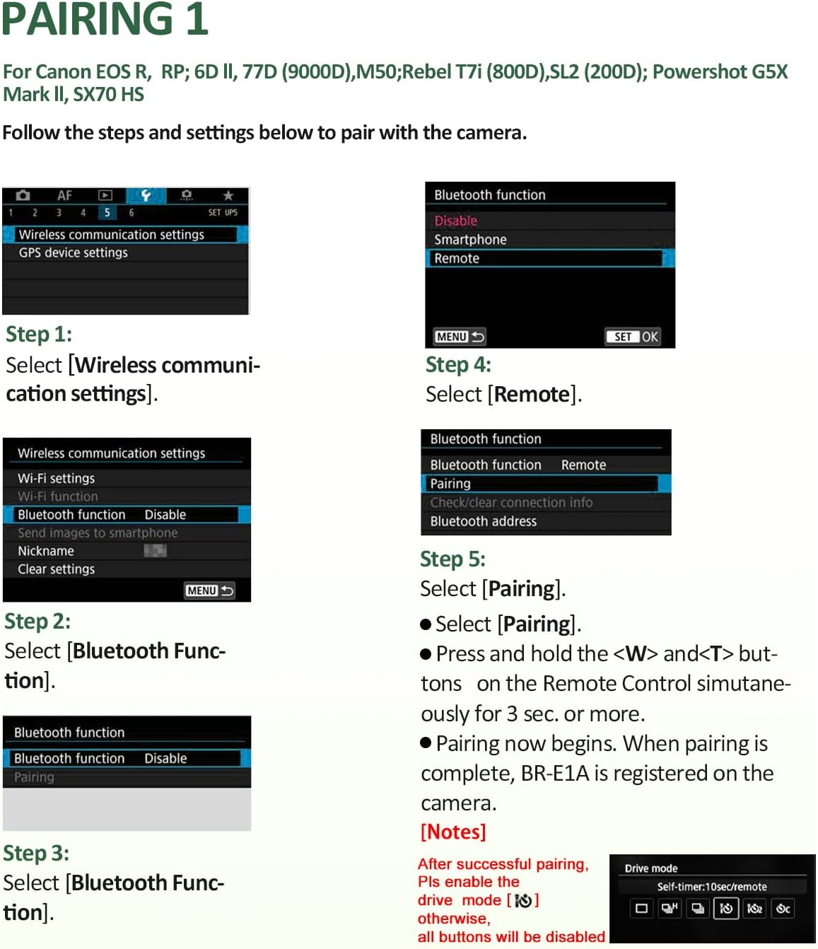- Easy To Use:For picture Please notice that when you pair it pls Make sure SET YOUR CAMERAS TO DRIVE MODE .For video shooting: Set the camera for movie shooting and set [Remote control] to [Enable] from the menu screen of the camera.