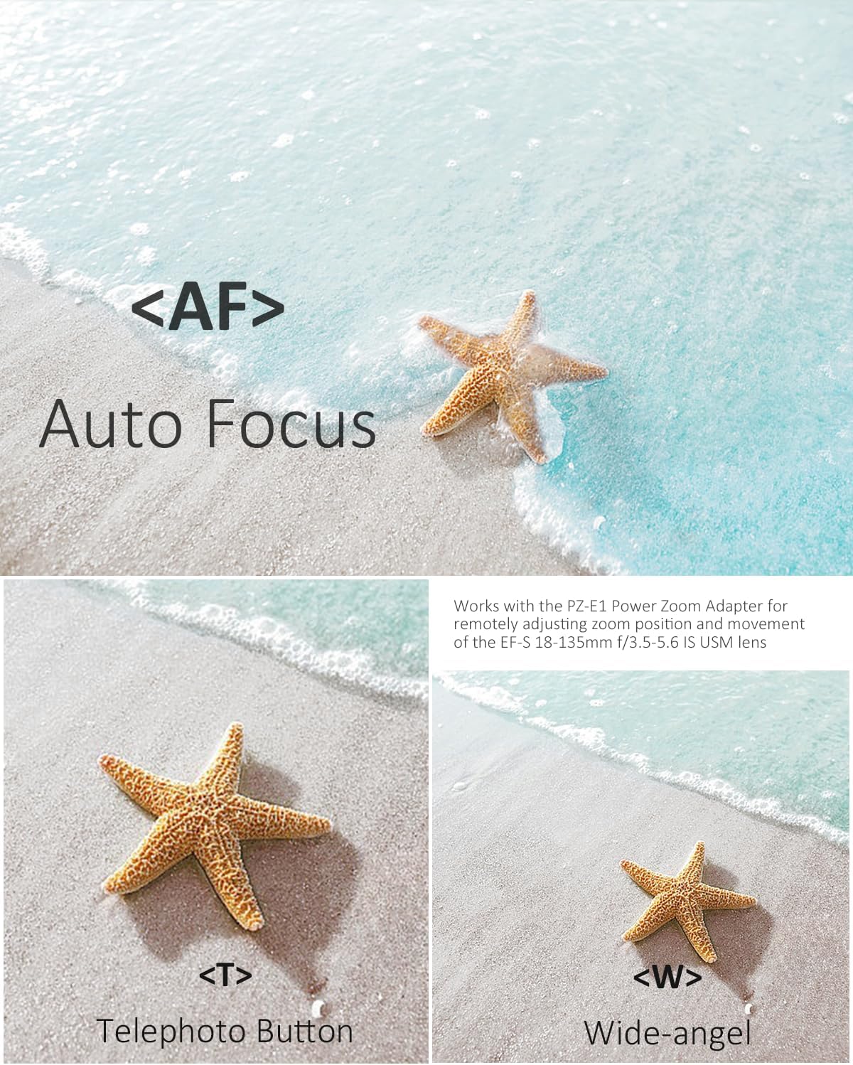- Function: This wireless shutter remote supports auto-focus, single shooting, continuous shooting, 2-sec. delay, Bulb(long exposure), start/stop video recording, zoom in/out. (Zoom function only works when using EF-S 18-135mm f/3.5-5.6 IS USM lens with the Canon PZ-E1Power Zoom Adapter)