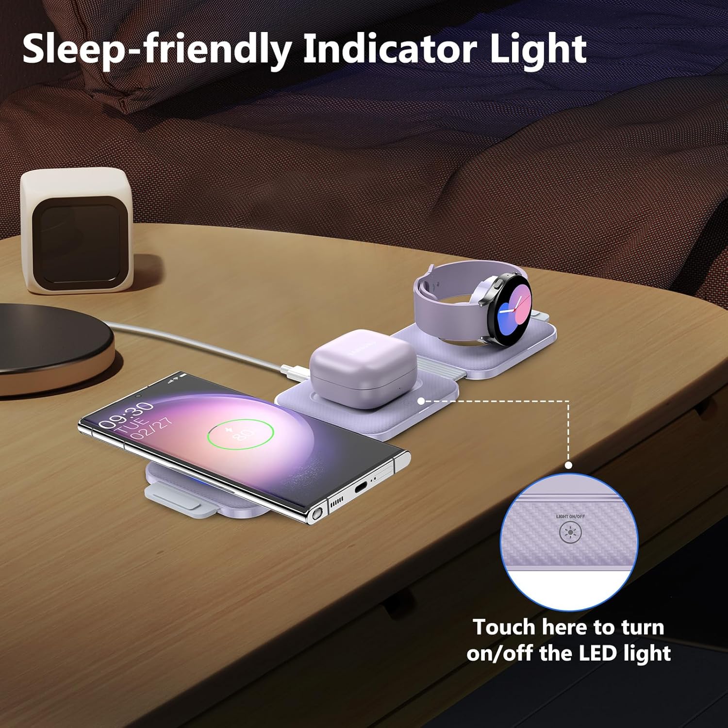 - 【 Sleep & User-friendly Charger】Design with a turn ON/OFF function. Easy to turn off the LED light with the touch button (next to the earbuds charging area). 3 In 1 design solving the problem of messy charger cables on your desk. The foldable and adjustable design makes your business trip and vacation convenient and happier.