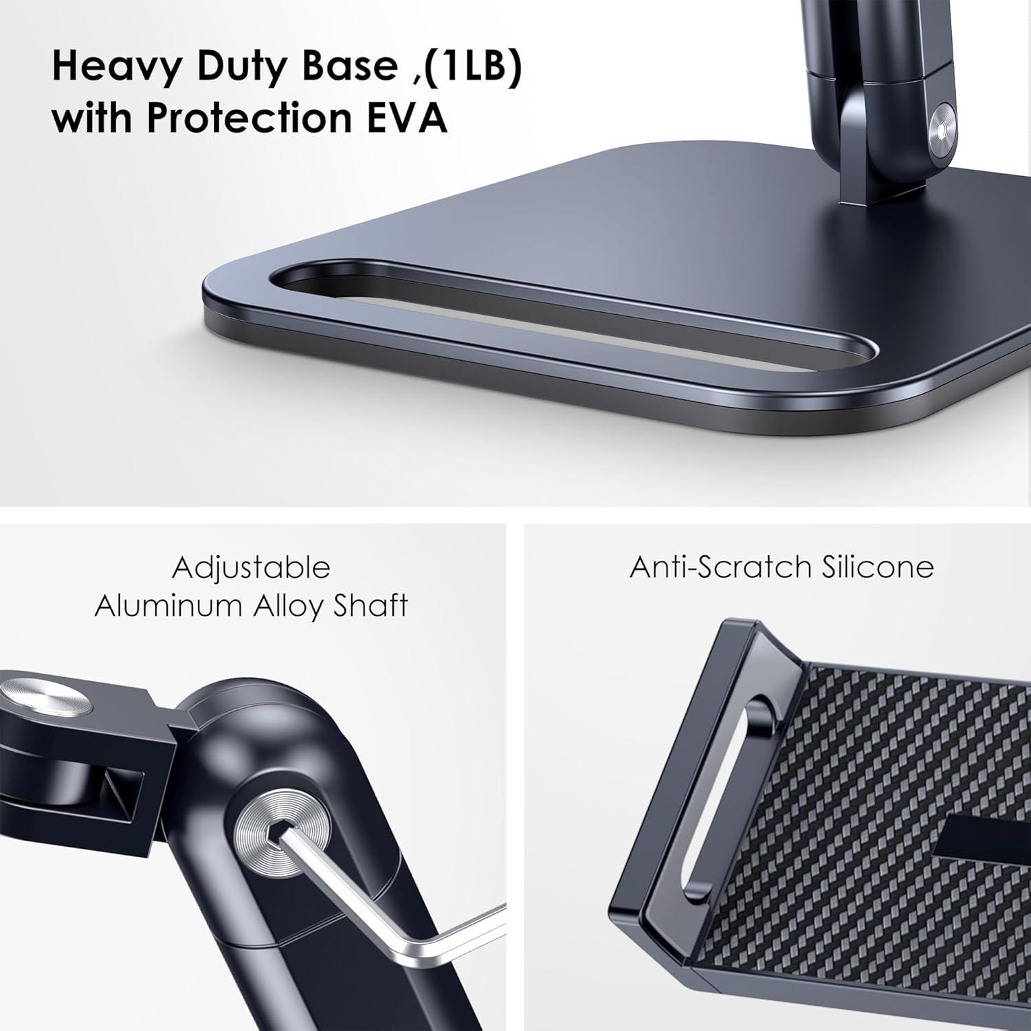 - Larger Heavy Duty iPad Holder Stand: This adjustable desktop iPad holder is made of aluminum with a thicker, wider, and heavier base designed for superior stability and durability. It provides 10 times more stable support without wobbling than regular desktop tablet stands that use plastic, making it ideal for larger tablets like the iPad Pro 12.9 stand.