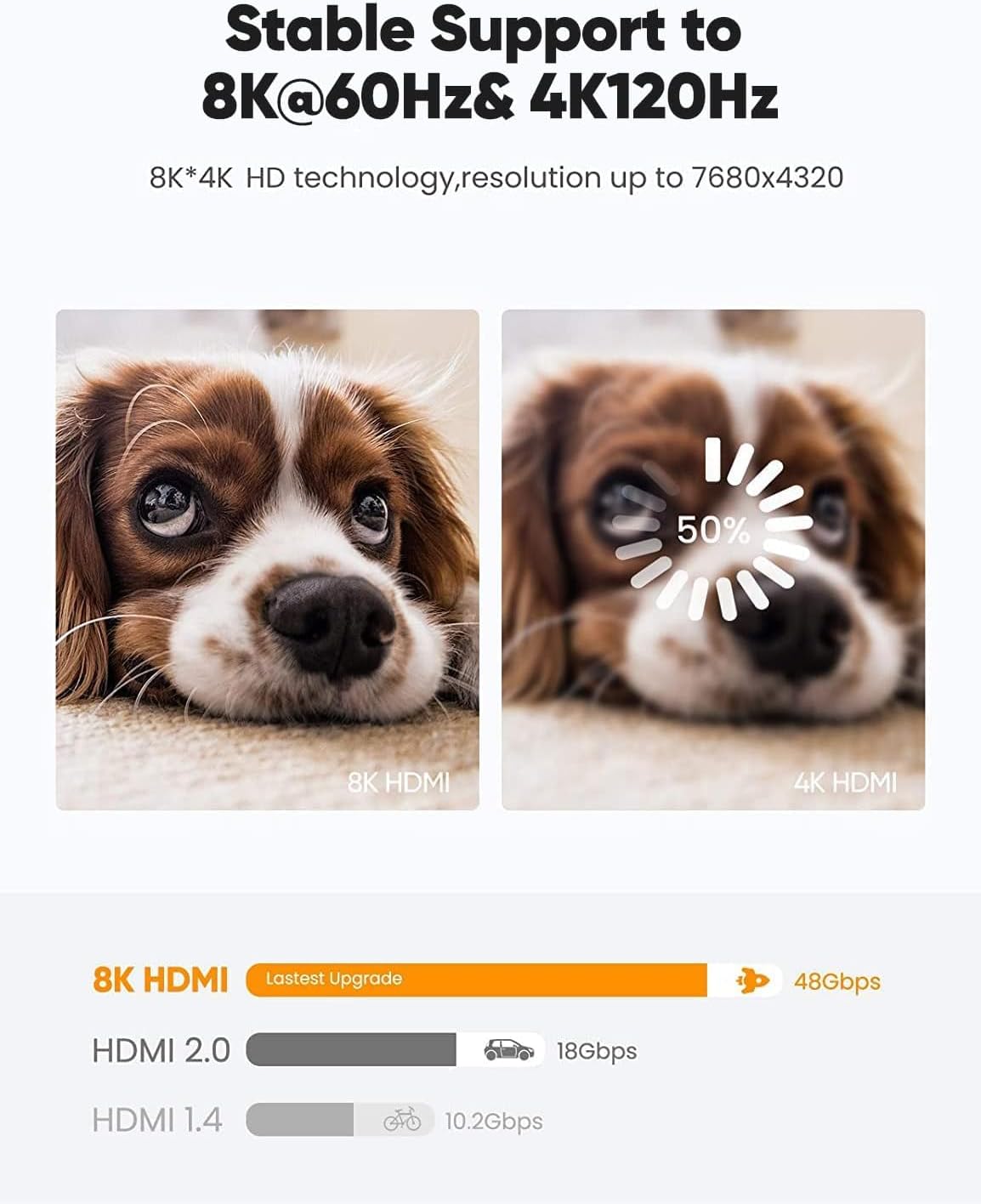 - 【HDMI Cable For Game Enthusiasts】 This HDMI Cable is not limited to 4K@60HZ, it can break through 4K and achieve 8K ultra-high image quality. It can also achieve a super smooth picture of 4K@120HZ. Its latest game mode supports variable refresh rate, maximizes the value of the graphics card and CPU, and is more accurate in the processing of rendered images. When the scene is switched, the refresh rate will change accordingly to obtain a smoother and more detailed picture.