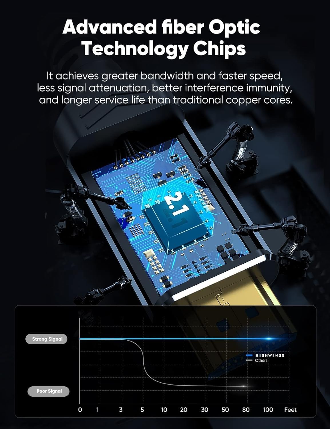 - 【8K Optical Fiber HDMI Cable】8K optical fiber HDMI cable is evolving rapidly; it realizes ultra-long-distance audio and video transmission, without signal compression, no delay in light speed transmission, no electromagnetic interference, and no radiation. It is compatible with 8K@60HZ and 4K@120HZ, clearly displays every particle, and accurately processes every signal source.