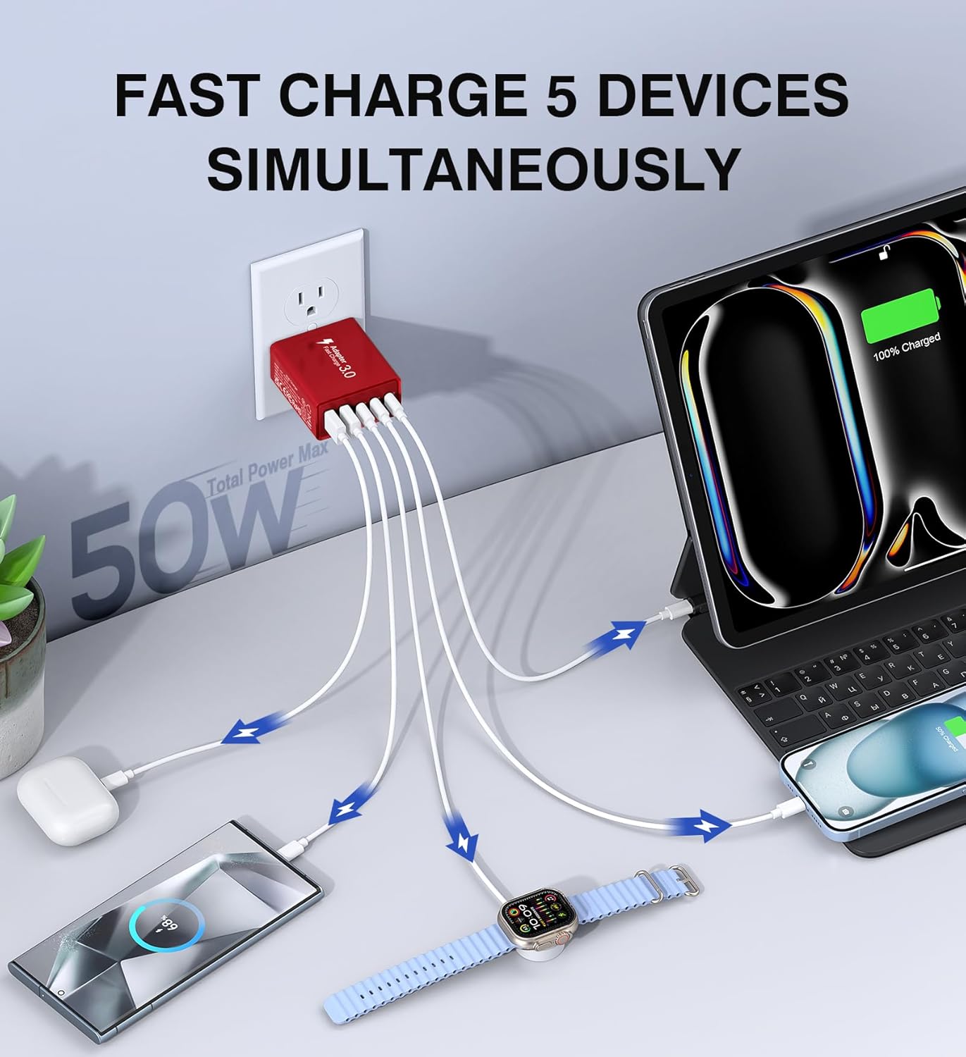 - Compact and Portable:The 5-port charging cube boasts an incredibly compact size that enhances portability. All of this power is housed in a pocket-friendly compact body wherever the journey takes you. Perfect for home, office and on the go. Is the best significant other on the go. We offer this 50W 5-port USB C wall charger (cable not included)